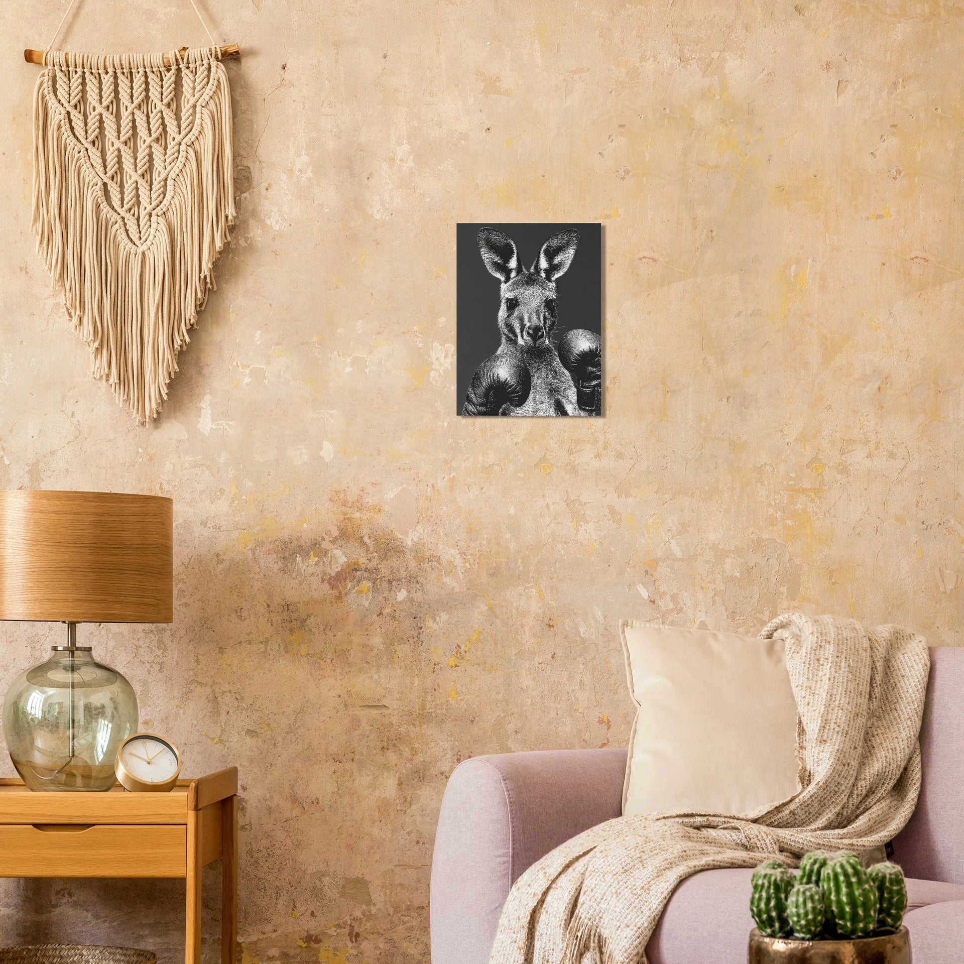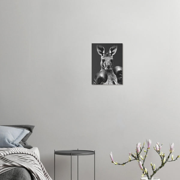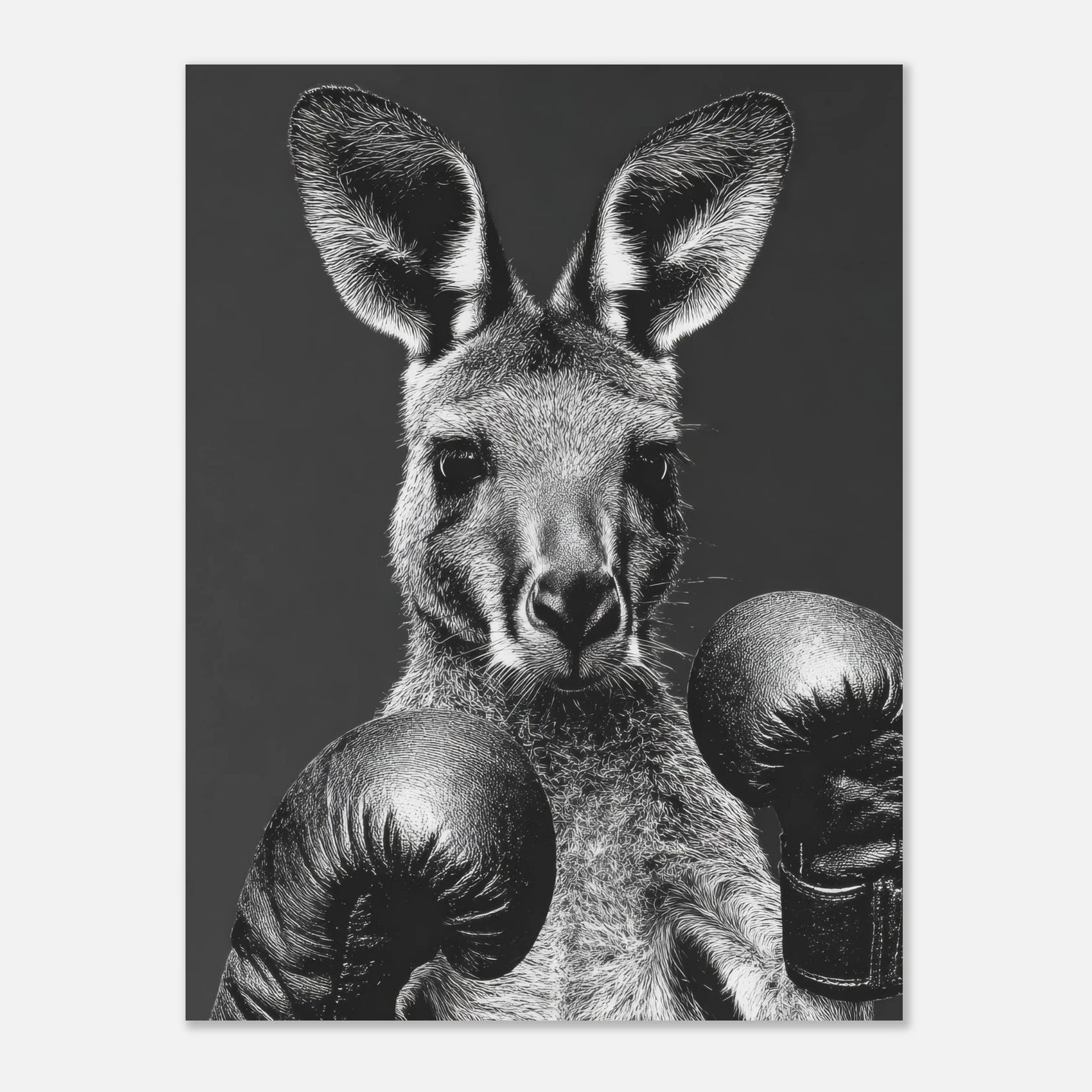 Unleash the spirit of the wild in a captivating monochrome with our 'Boxing Kangaroo Gaze' art print. This striking piece captures the intense, ready-for-anything gaze of a kangaroo adorned in boxing gloves, rendered with intricate detail in a powerful black and white palette. It’s perfect for adding a touch of bold character and sophisticated whimsy to any room, appealing to animal lovers and those who appreciate unique, expressive art.