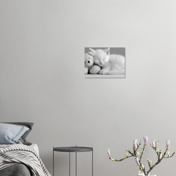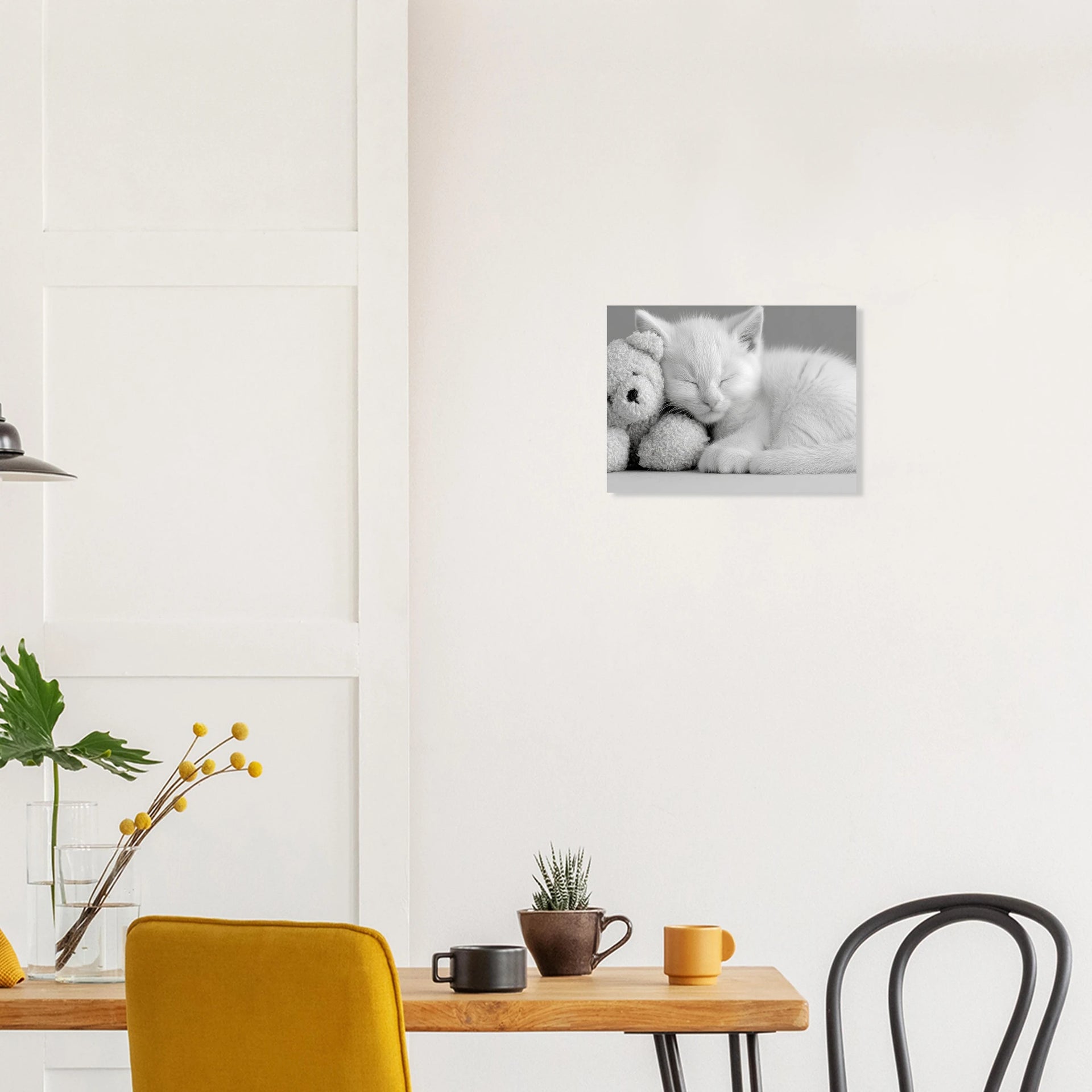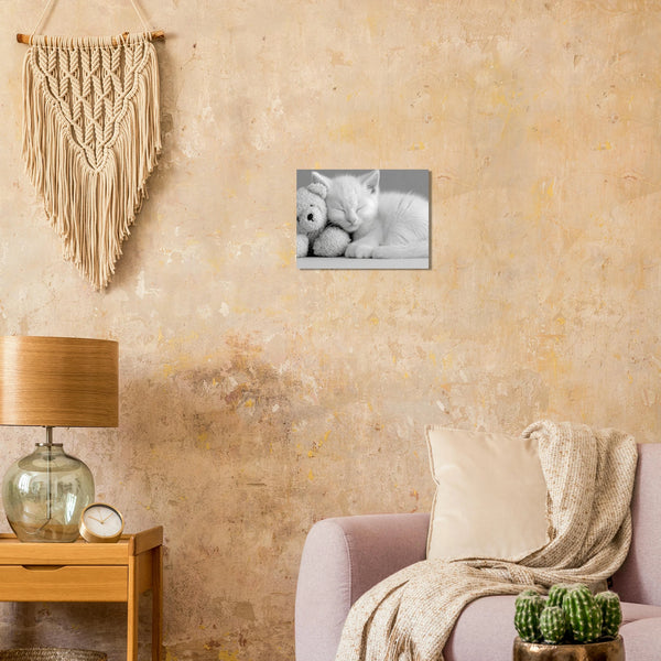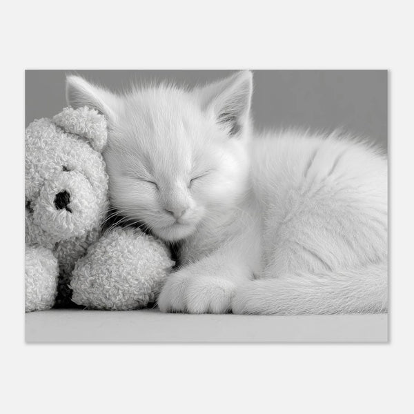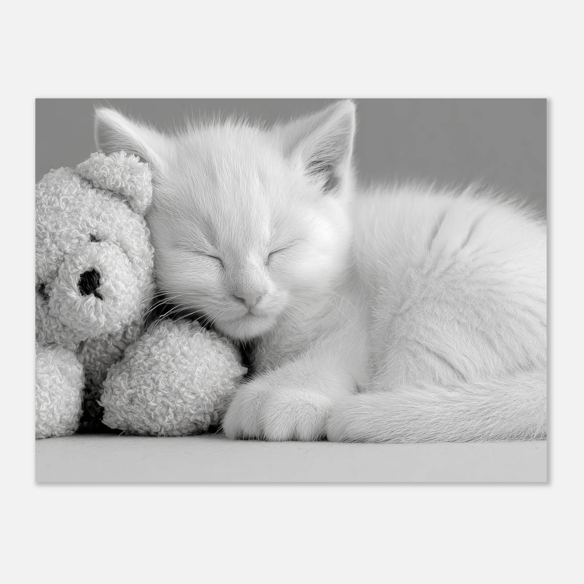 Bring a touch of serene innocence to your space with our "Animals" art print, capturing the tender moment of a tiny kitten nestled peacefully beside its plush teddy bear. This heartwarming black and white depiction evokes a feeling of calm and comfort, making it a perfect addition to a nursery, bedroom, or any cozy corner in your home. The gentle embrace and soft textures are beautifully rendered, inviting you to pause and enjoy the quiet beauty of animal friendship.
