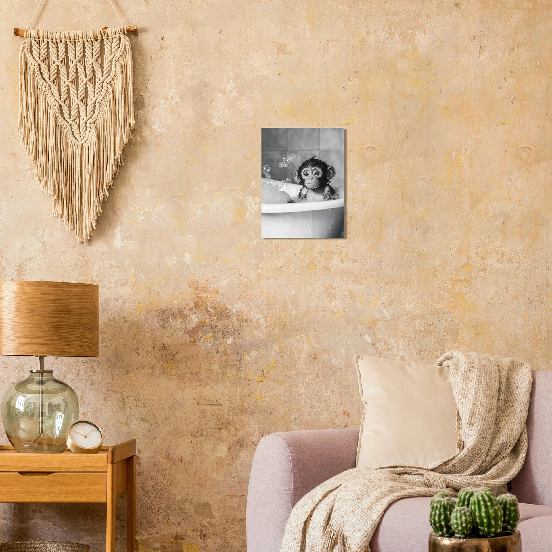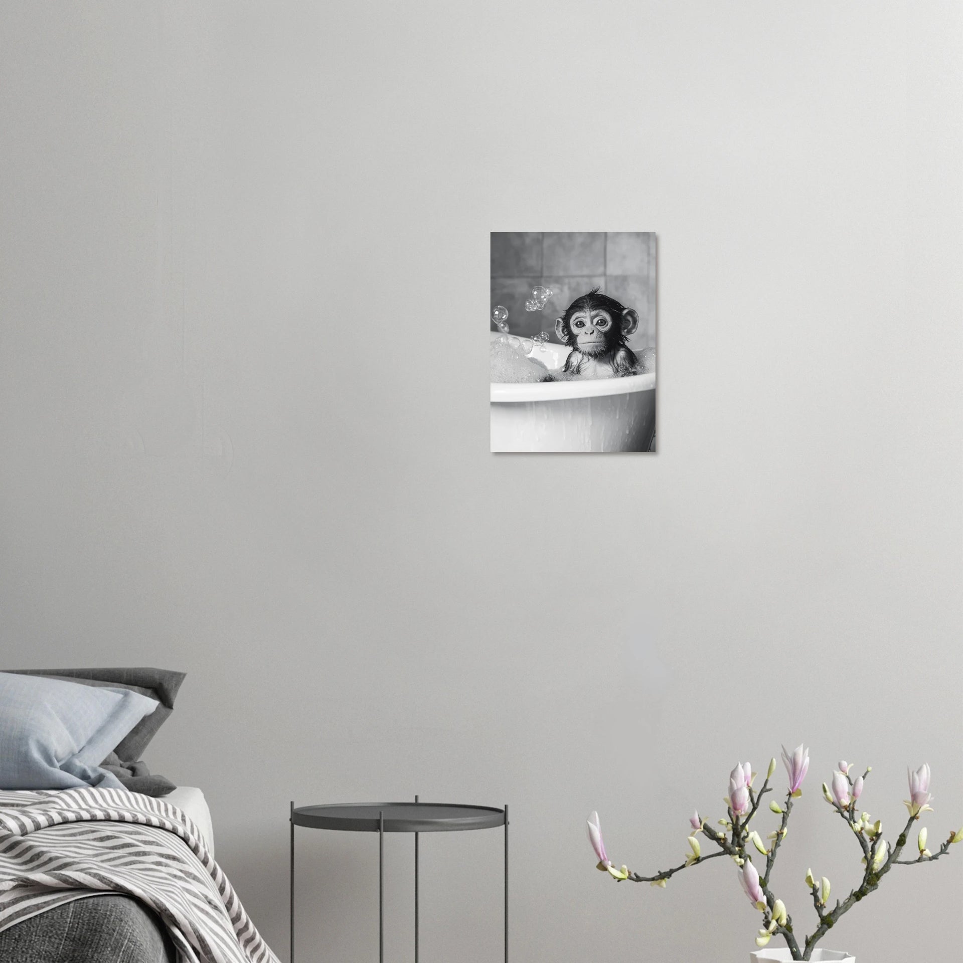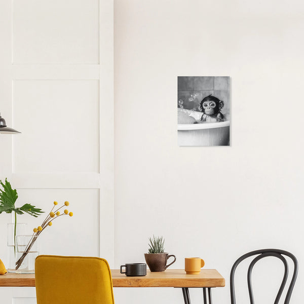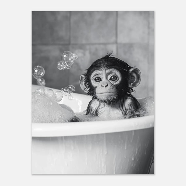 Bring a touch of playful innocence and heartwarming charm into your home with our "Little Monkey Bath Time" art print. This captivating black and white piece features an adorable baby monkey enjoying a bubbly bath, its wide, curious eyes and wet fur rendered with exquisite detail. It’s a perfect accent for nurseries, living rooms, or any space needing a smile-inducing focal point.