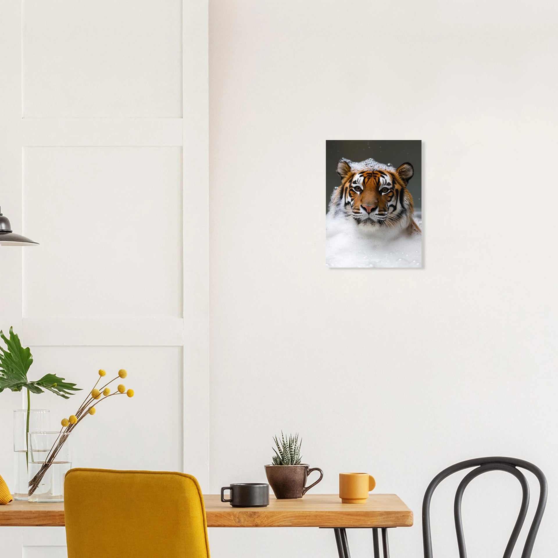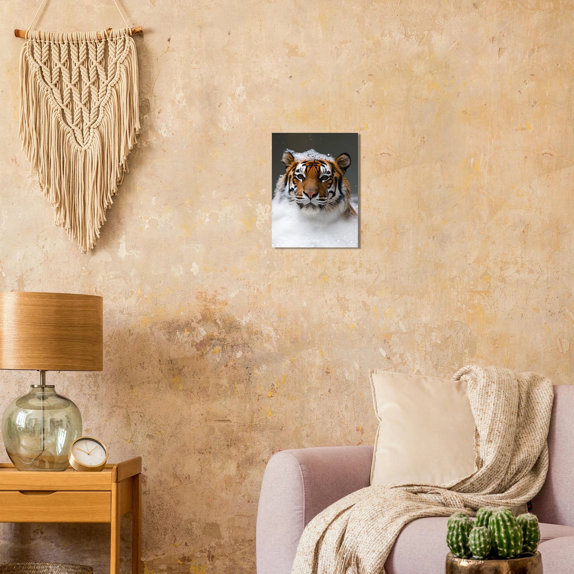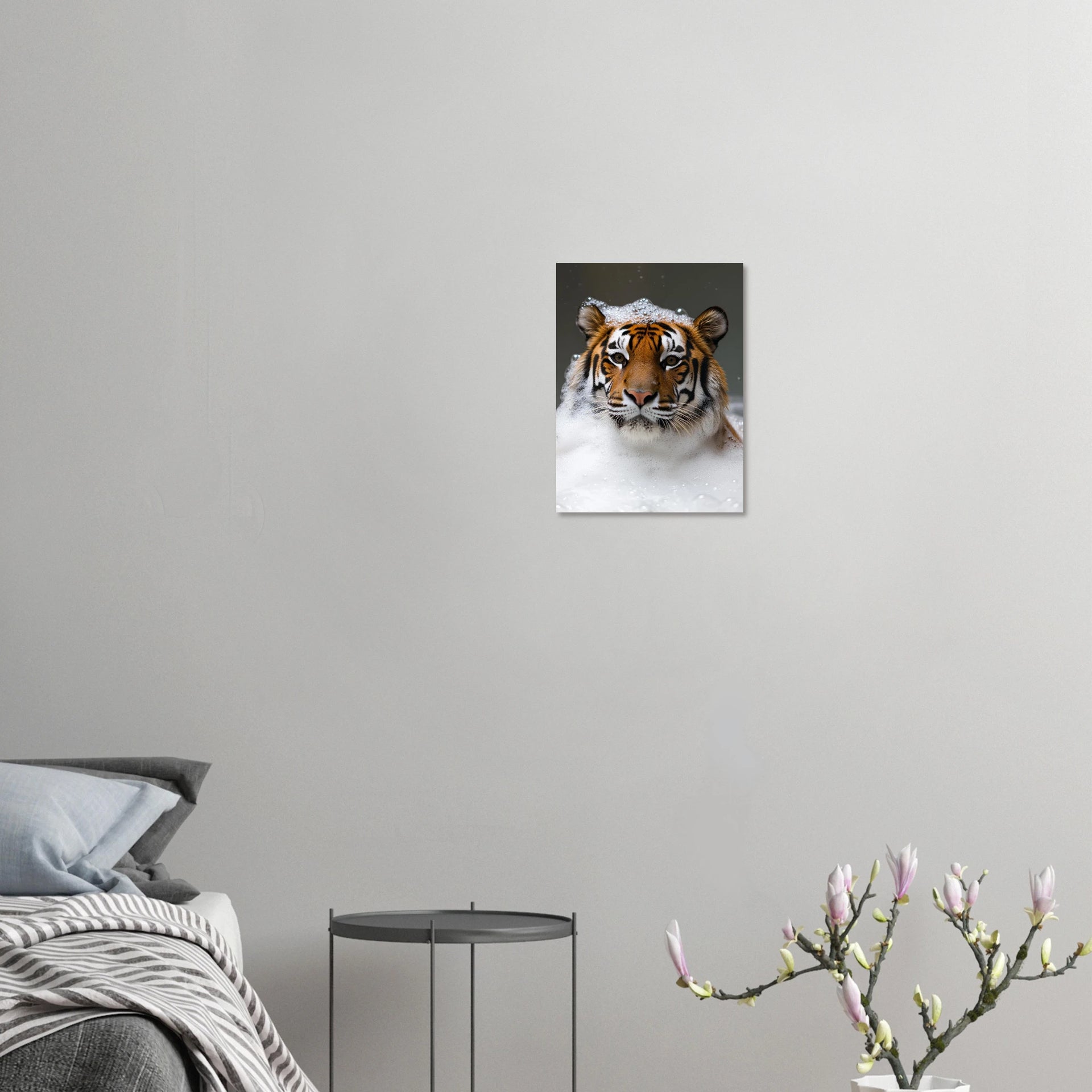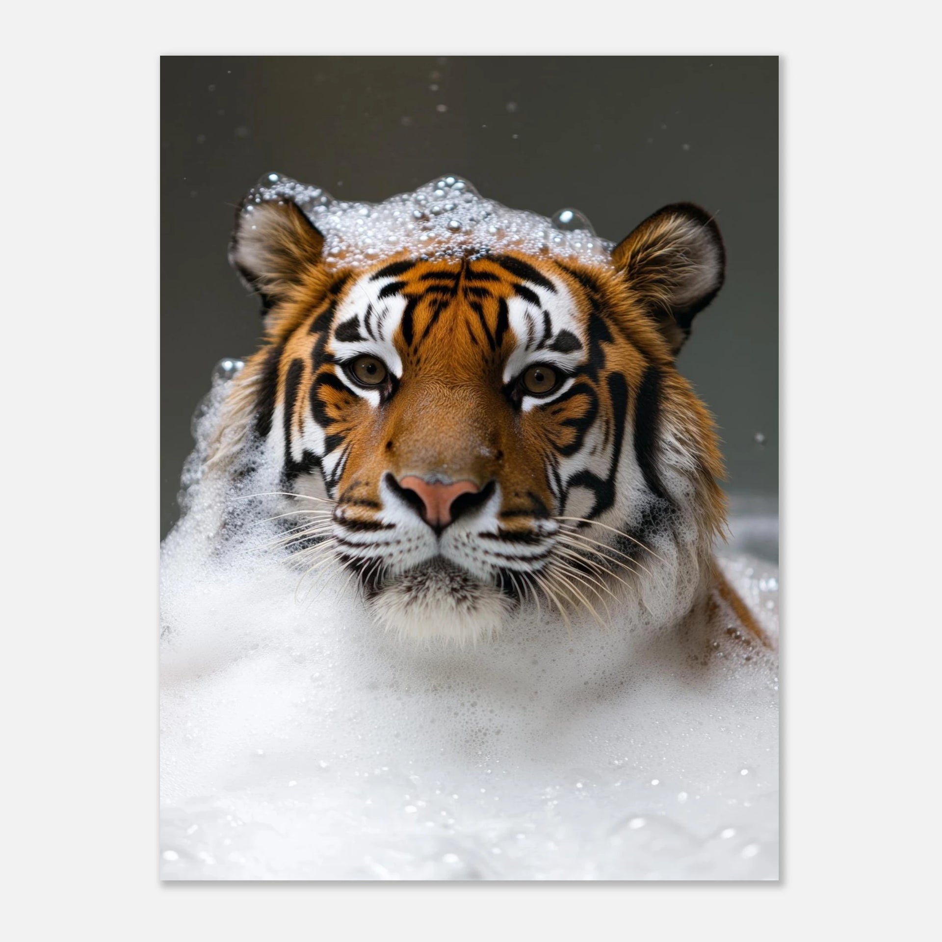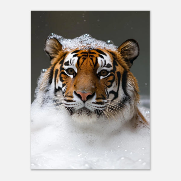 Bring a touch of playful wild elegance to your space with this captivating art print, featuring a magnificent tiger enjoying a luxurious bubble bath. The striking contrast of its iconic stripes against the soft, effervescent foam creates a unique and heartwarming image, perfect for adding character and a hint of unexpected charm to any room. This piece is ideal for animal lovers and those who appreciate art with a distinctive narrative.