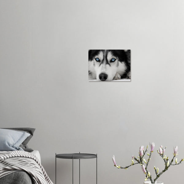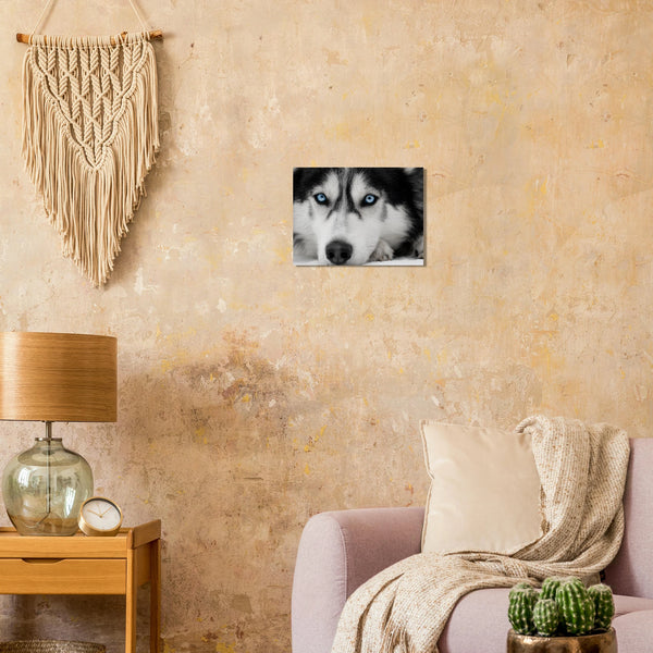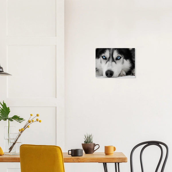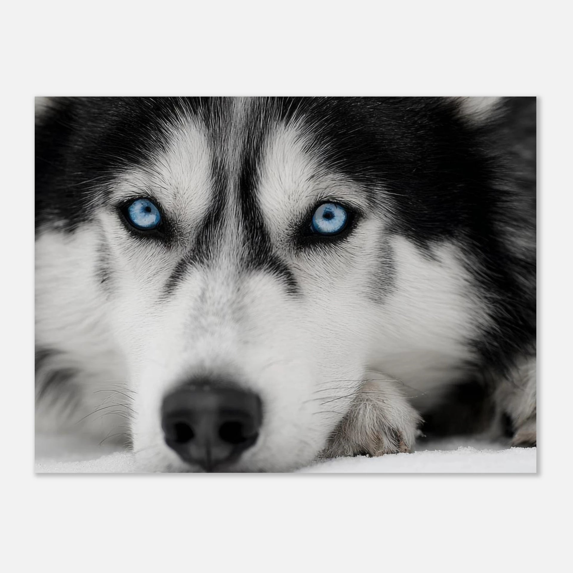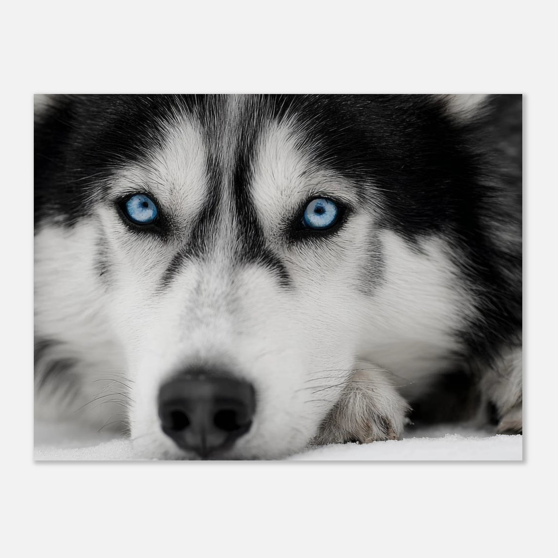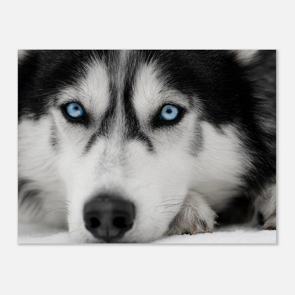 Capture the captivating gaze of a Siberian Husky with this stunning art print. The piercing blue eyes and luxurious black and white fur of this majestic animal are rendered with breathtaking detail, making it a focal point in any room. Perfect for dog lovers and those who appreciate the beauty of nature's most iconic creatures, this print brings a serene yet powerful presence to your home.