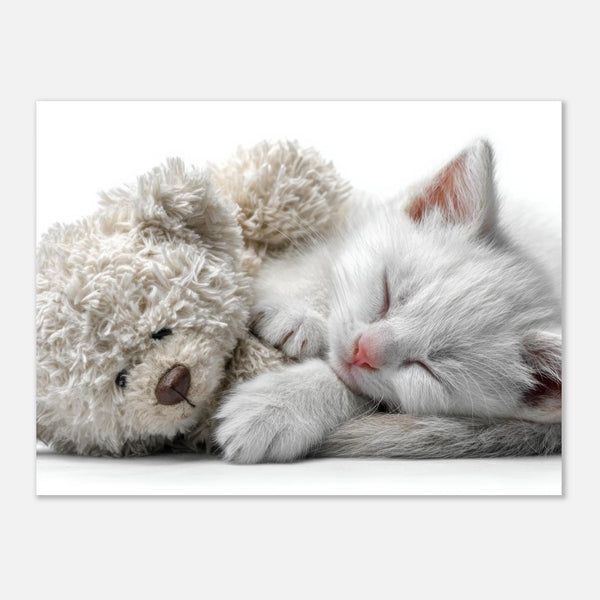 Printed on our premium matte paper, each detail of the kitten's delicate fur and the bear's plush texture is beautifully preserved. The smooth, uncoated finish offers a luxurious, non-reflective feel that enhances the peaceful mood of the artwork. Choose the perfect dimensions to complement your space, from intimate accents to statement pieces, and bring this endearing image to life in your home.