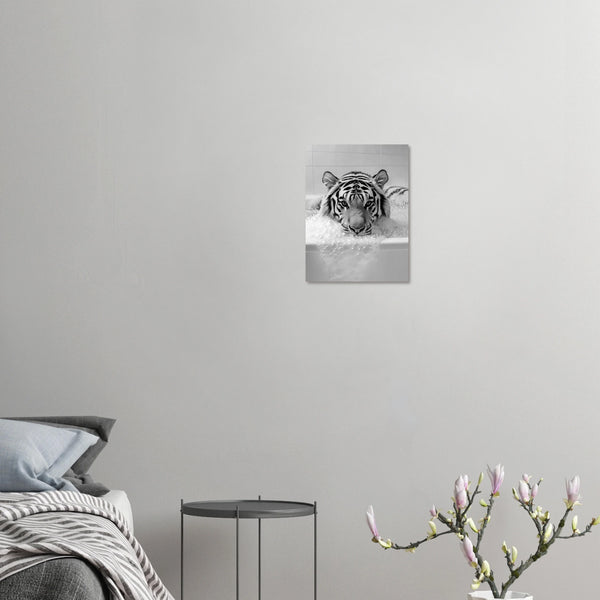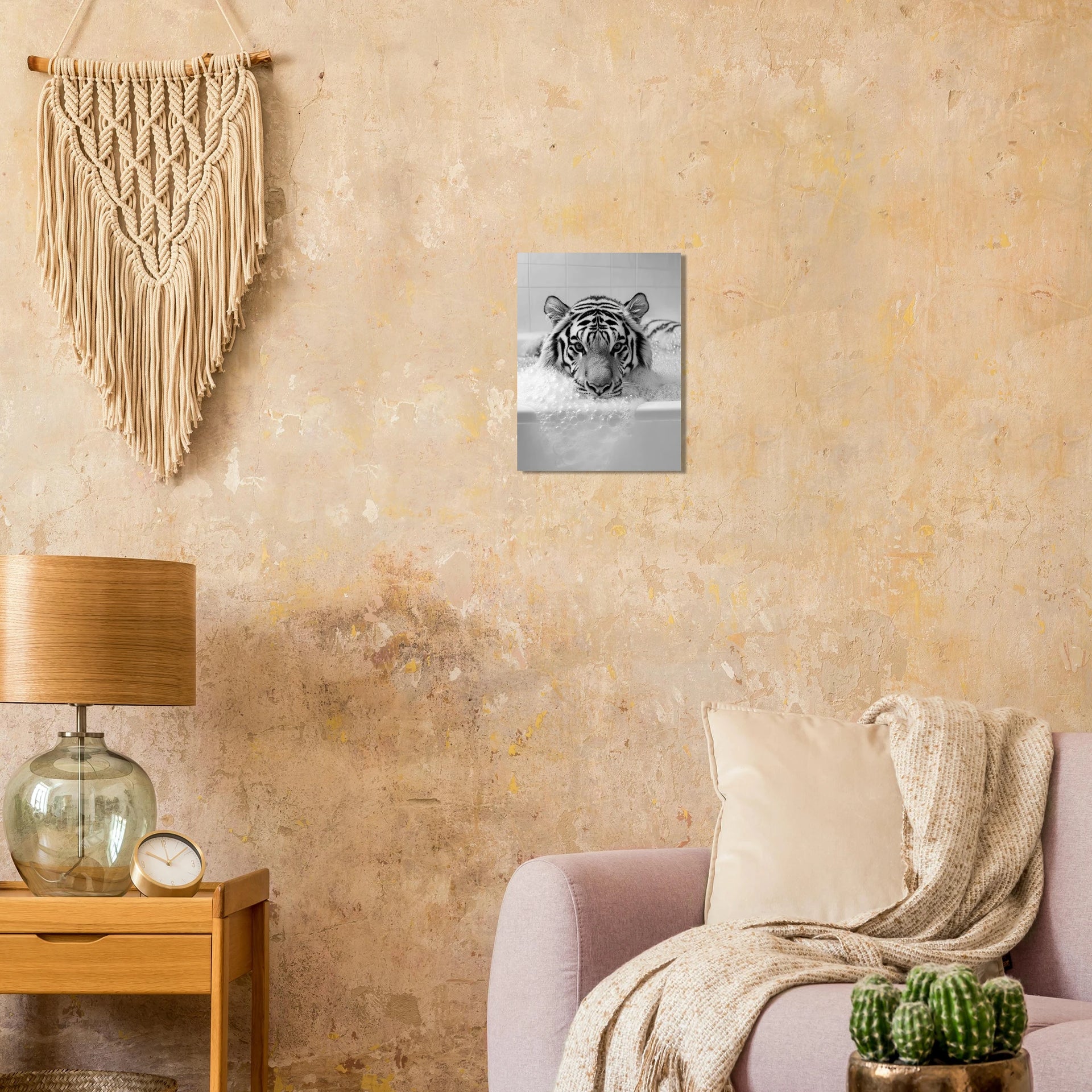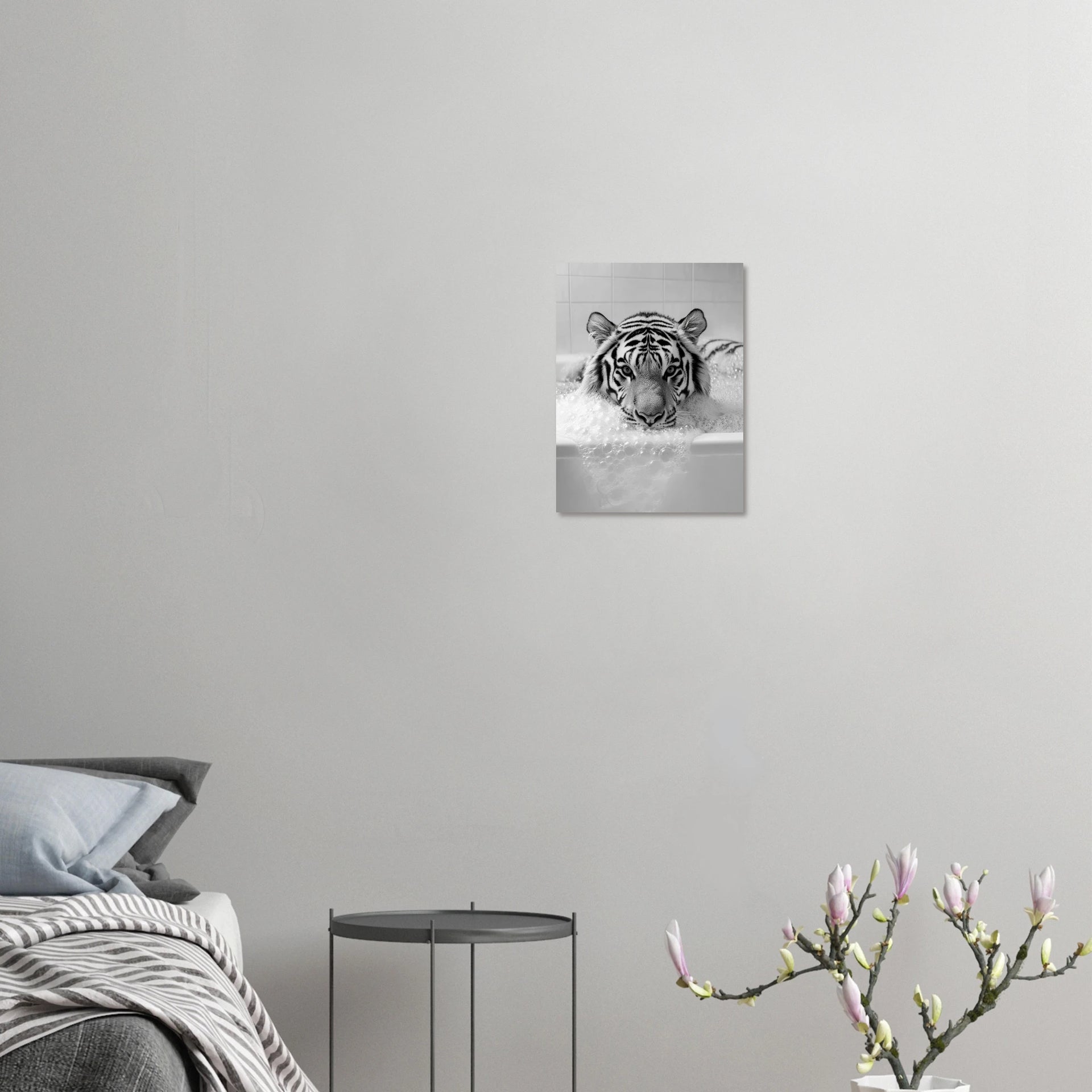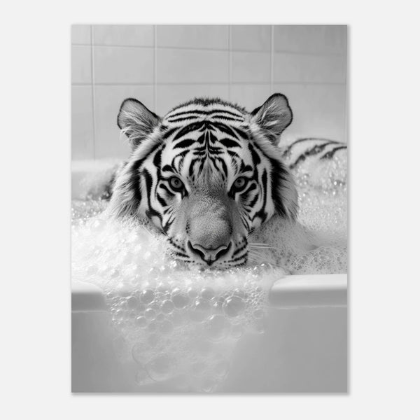 Bring an unexpected touch of serene wilderness into your space with our captivating "Zen Tiger in Bubbles" matte poster print. This unique black and white artwork portrays a powerful tiger in a surprisingly tranquil bath, its striking gaze emerging from a sea of soft bubbles. It’s a sophisticated and conversation-starting piece perfect for art lovers and those who appreciate the extraordinary.