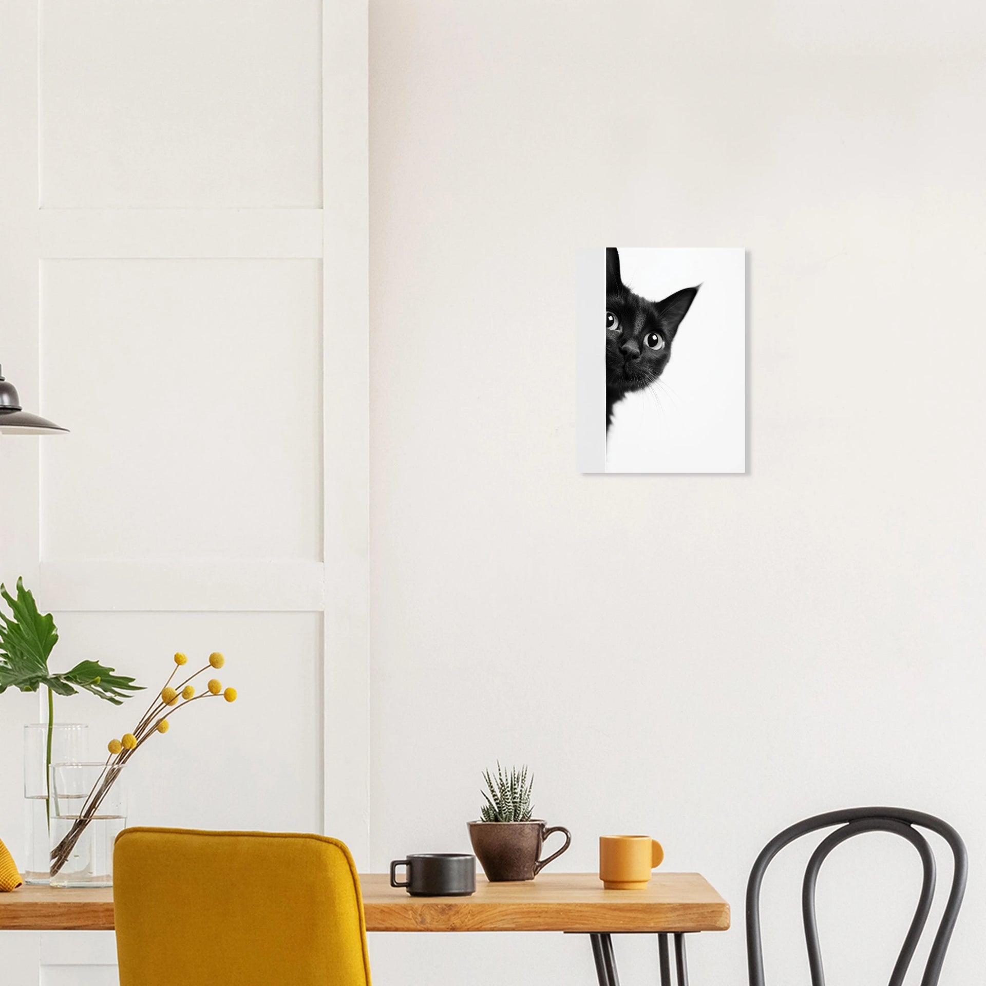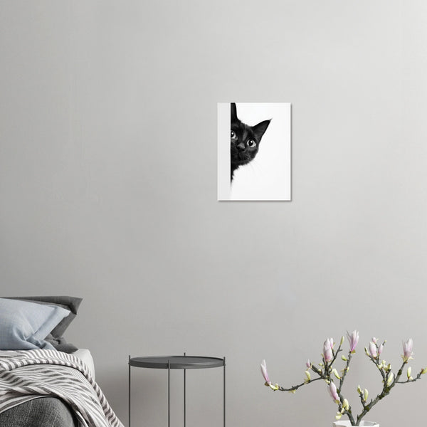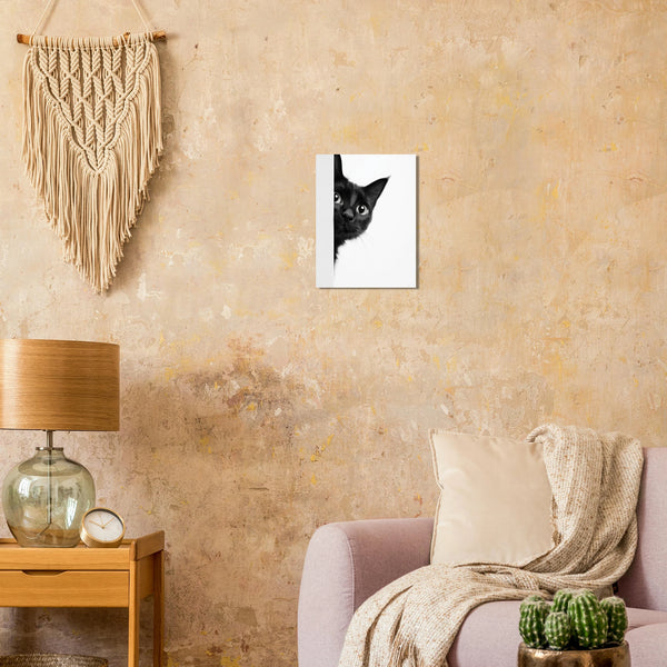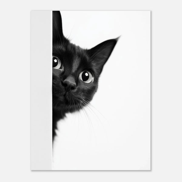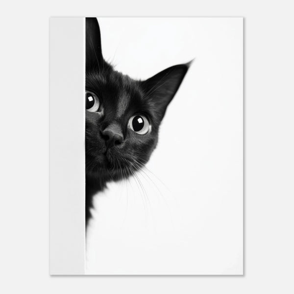 Capture the enchanting gaze of a curious black cat with this captivating poster print. Its monochromatic palette and minimalist design highlight the feline's expressive eyes and delicate whiskers, making it a perfect statement piece for any modern home or office. This art print brings a touch of playful mystery and elegance, inviting a second look and sparking conversation.