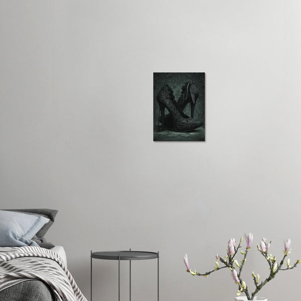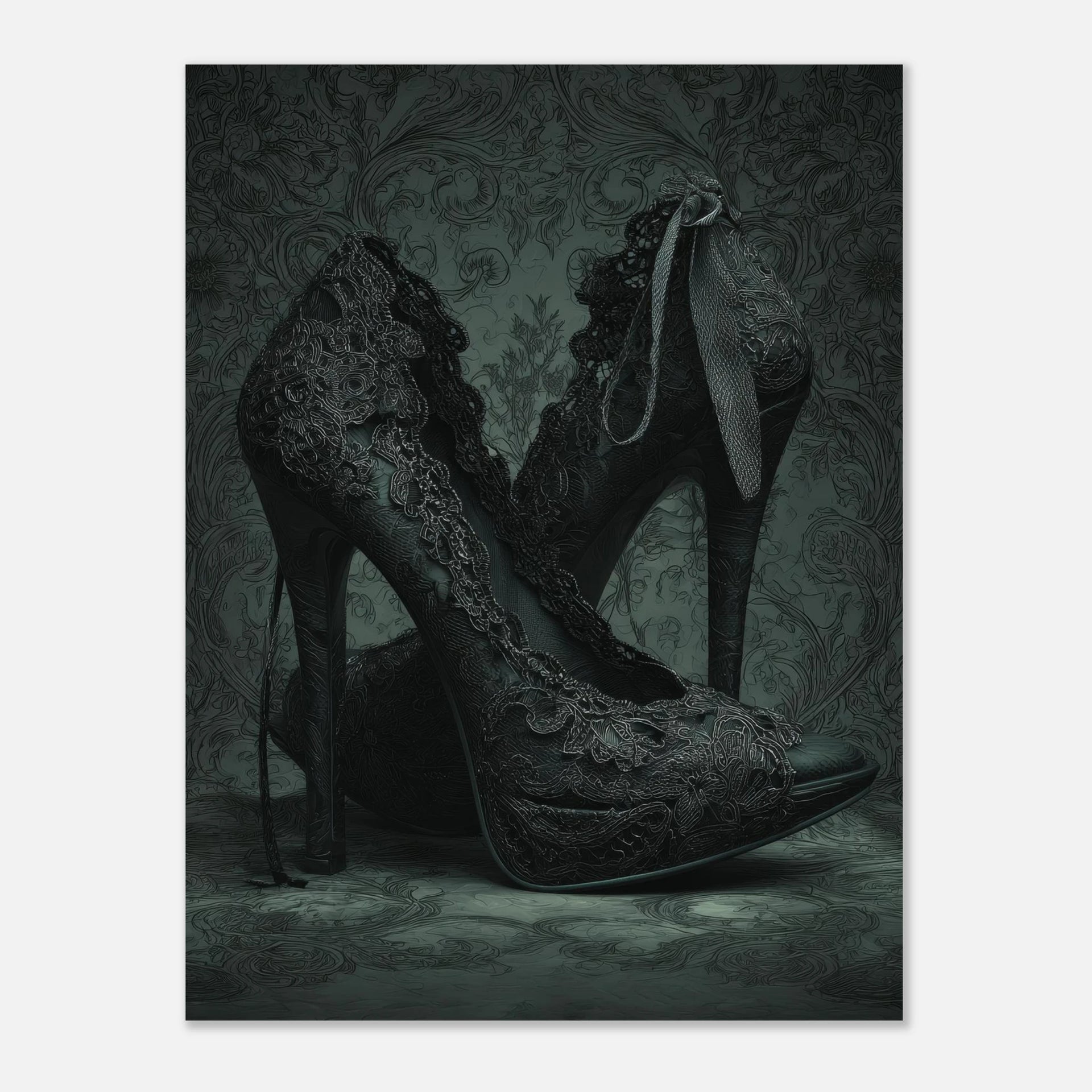 Step into a world of sophisticated darkness with our "Elegant Noir Lace Heels" art print. This stunning piece captures the intricate beauty of lace-patterned high heels set against a rich, damask-inspired backdrop. The deep, moody color palette and delicate textures evoke a sense of gothic romance and timeless elegance, making it a perfect statement for any space that appreciates a touch of dramatic flair.