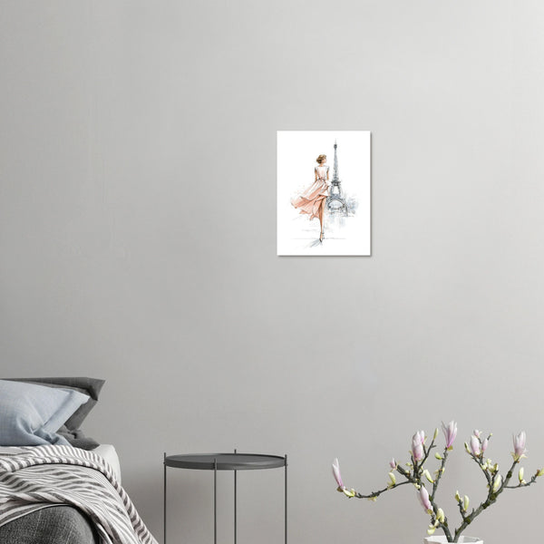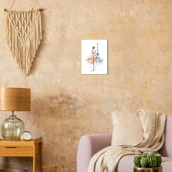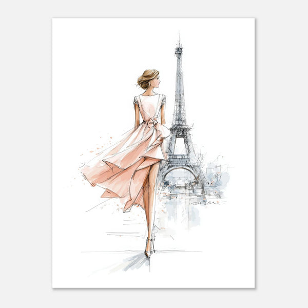Embrace the timeless elegance of Parisian style with this sophisticated watercolor sketch, where a blush-hued dress sways against the iconic Eiffel Tower. Perfect for elevating any living space or studio, this art print transports you to the heart of couture streets and inspires a sense of wanderlust and refined taste.