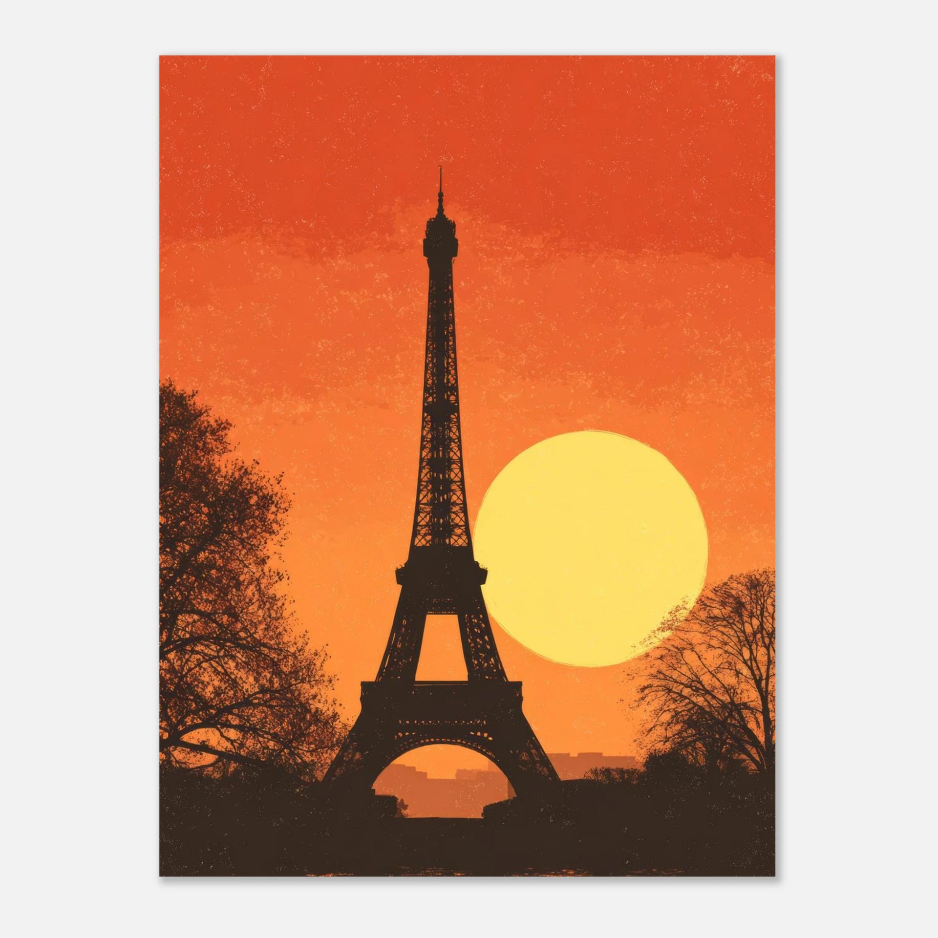 Capture the iconic romance of Paris with this vibrant Pop Art Eiffel Tower Sunset poster. This striking piece evokes the warmth of a Parisian evening, featuring the majestic Eiffel Tower silhouetted against a brilliant, oversized sun and a fiery orange sky. The unique grainy texture adds a touch of vintage charm, making it a perfect statement for any space yearning for a touch of classic travel allure with a modern artistic twist.