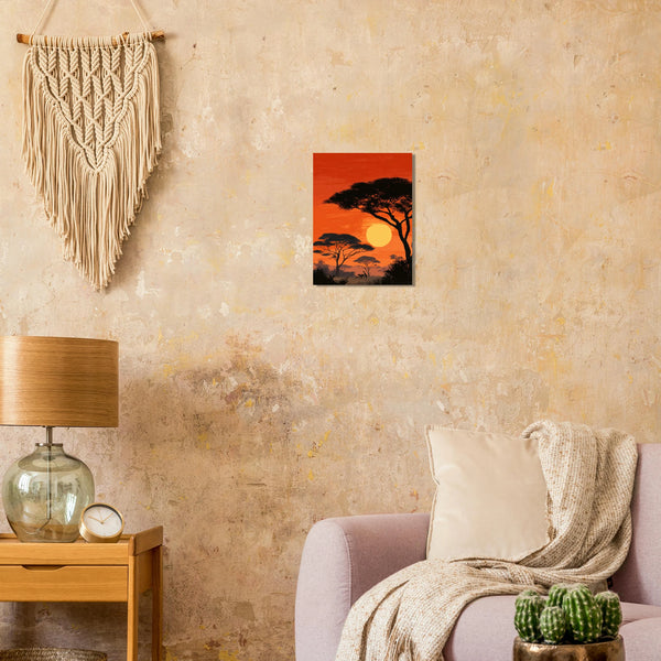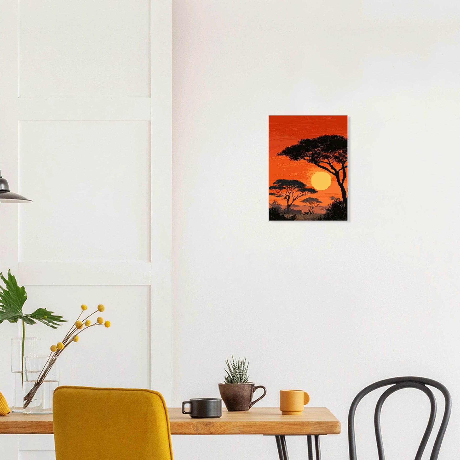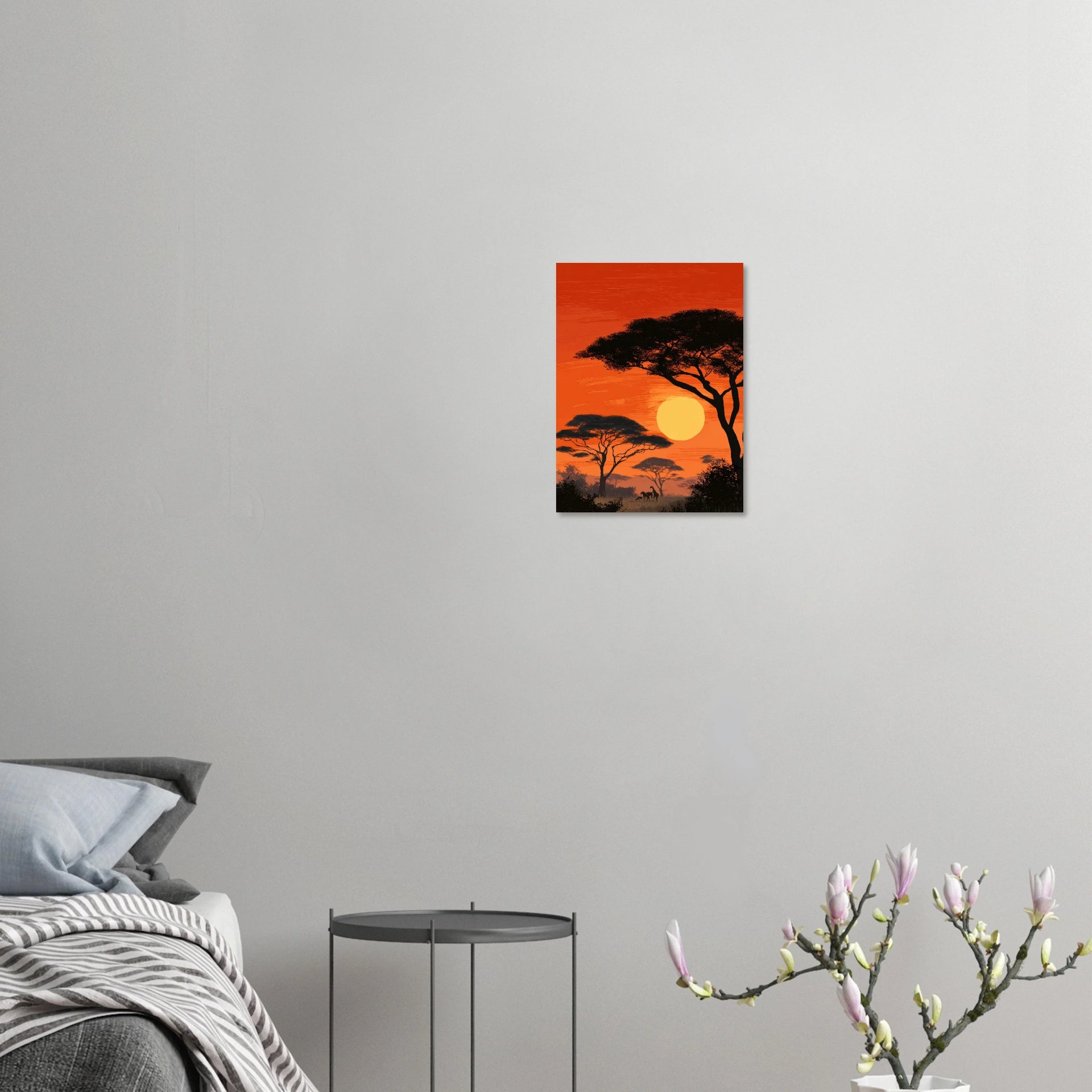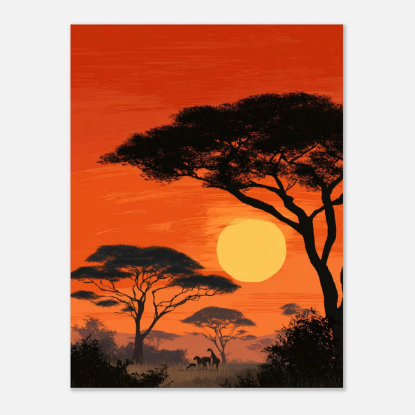 Immerse yourself in the breathtaking beauty of an African sunset with our captivating Pop Art print. This vibrant artwork transports you to the serene savannah, where silhouetted acacia trees stand majestically against a blazing orange sky, hinting at the wild beauty within. Perfect for art lovers and those seeking to infuse their space with warmth and adventure, this piece combines modern pop art aesthetics with the timeless allure of nature.