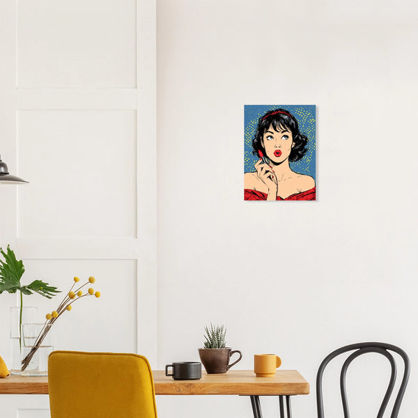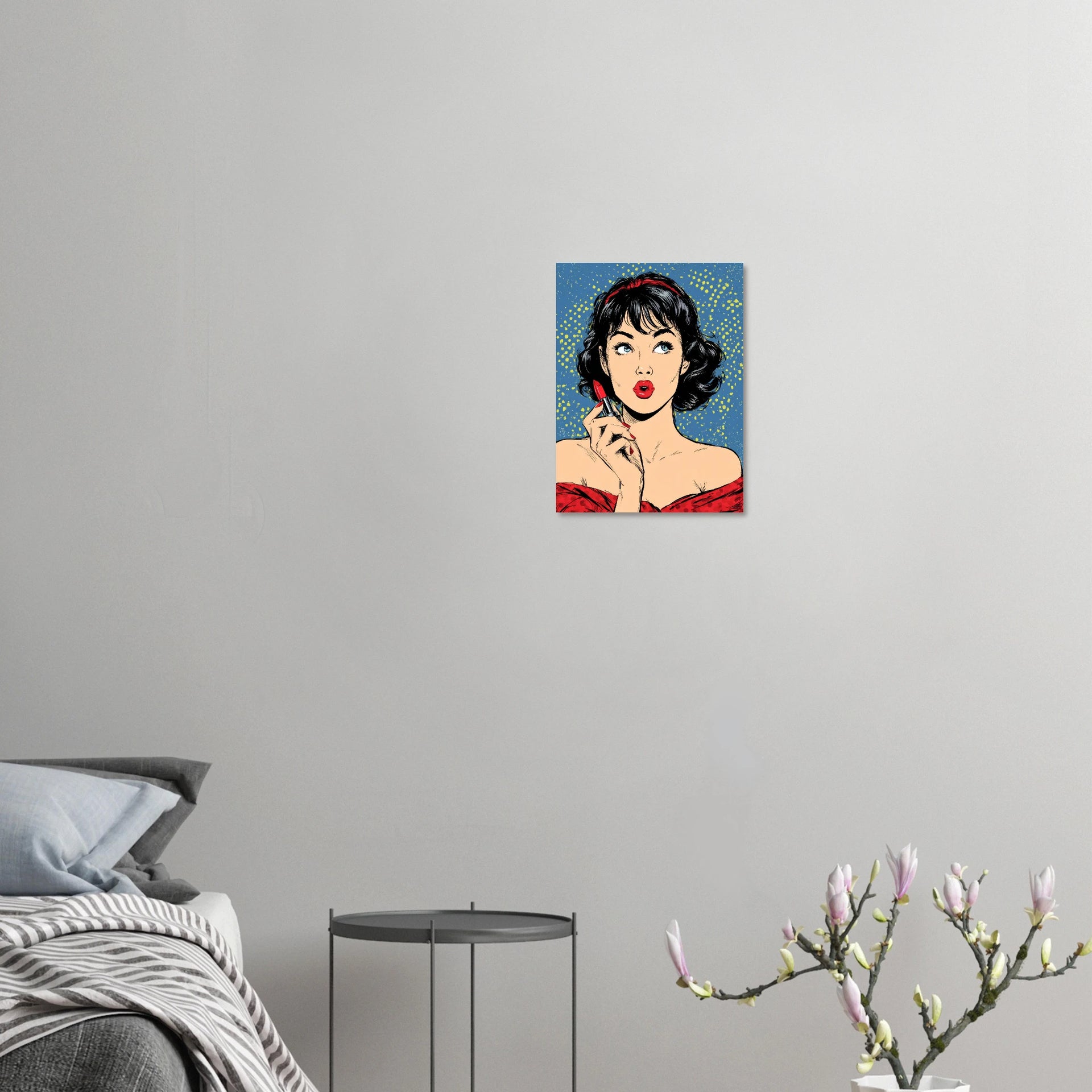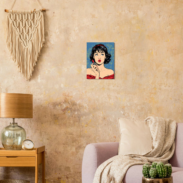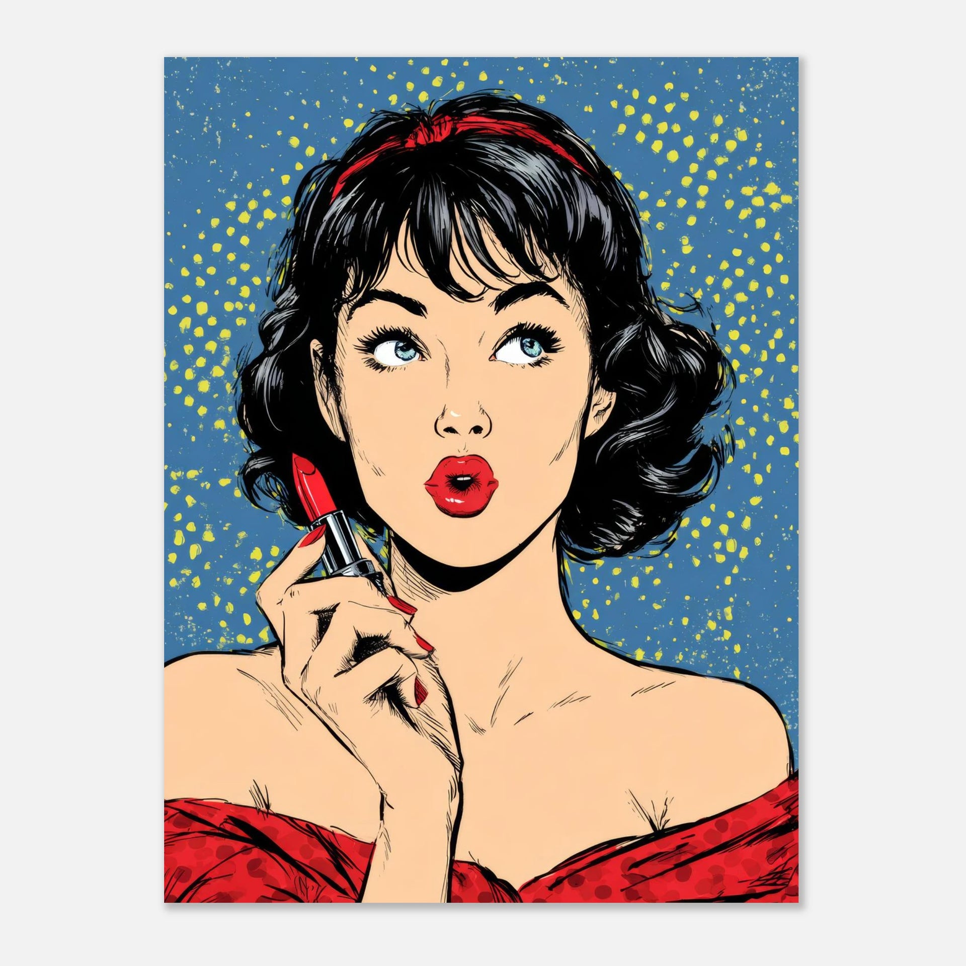 Unleash your inner leading lady with this captivating Pop Art poster, a vibrant homage to classic comic book romance and undeniable glamour. Featuring a stunning woman in mid-lipstick application, her striking blue eyes and bold red lips pop against a playful polka-dot background. This piece is perfect for adding a touch of vintage flair and powerful femininity to any space, sparking conversation and inspiring confidence.