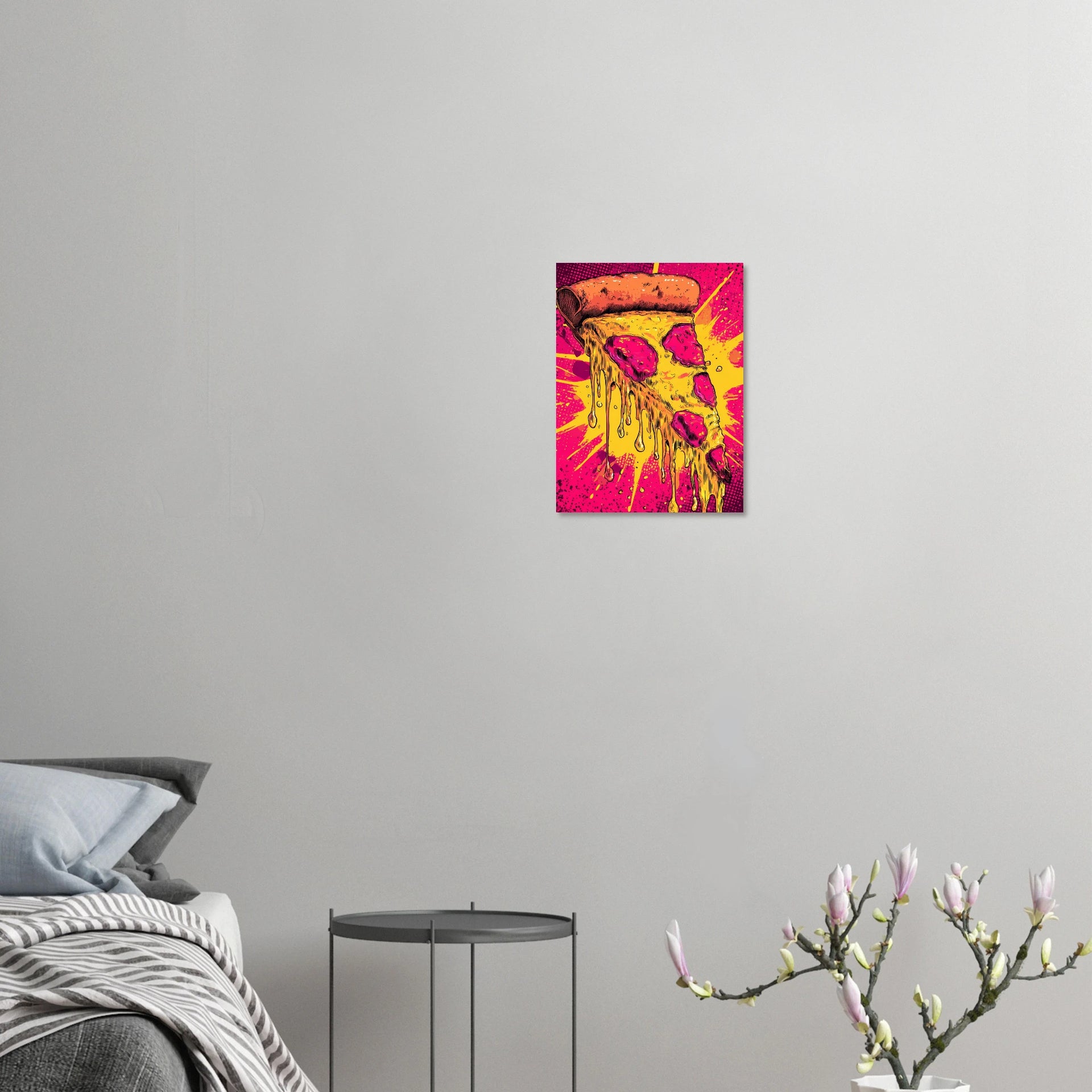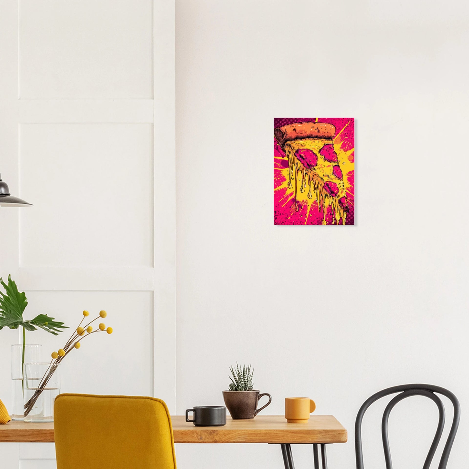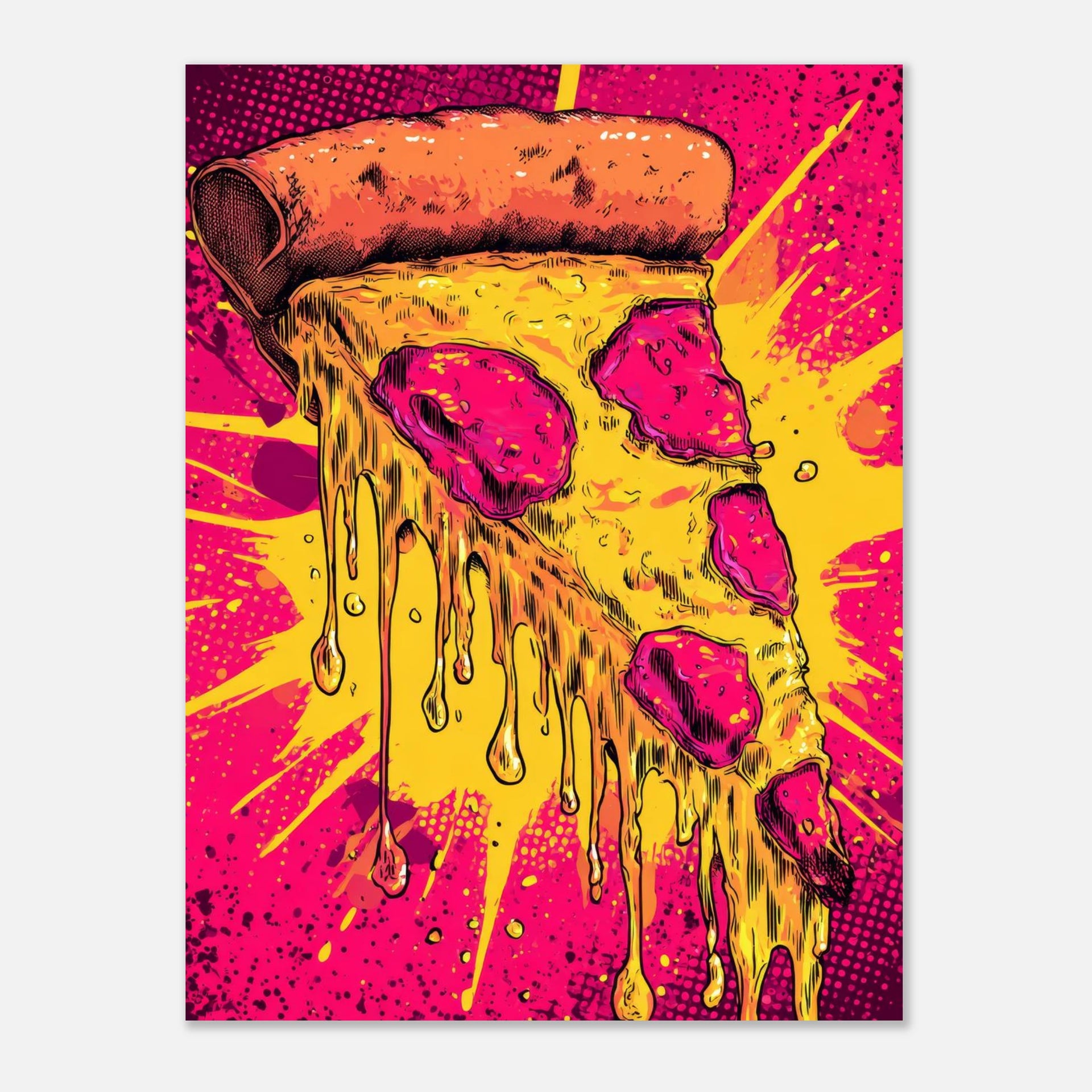 Bring a burst of delicious pop art energy into your space with this eye-catching melting pizza slice print. Featuring vibrant hues of hot pink, electric yellow, and rich orange, this artwork captures a moment of gooey, cheesy perfection with a dynamic, comic-book-inspired flair. It's the perfect statement piece for anyone who loves bold visuals and a playful touch of modern art.