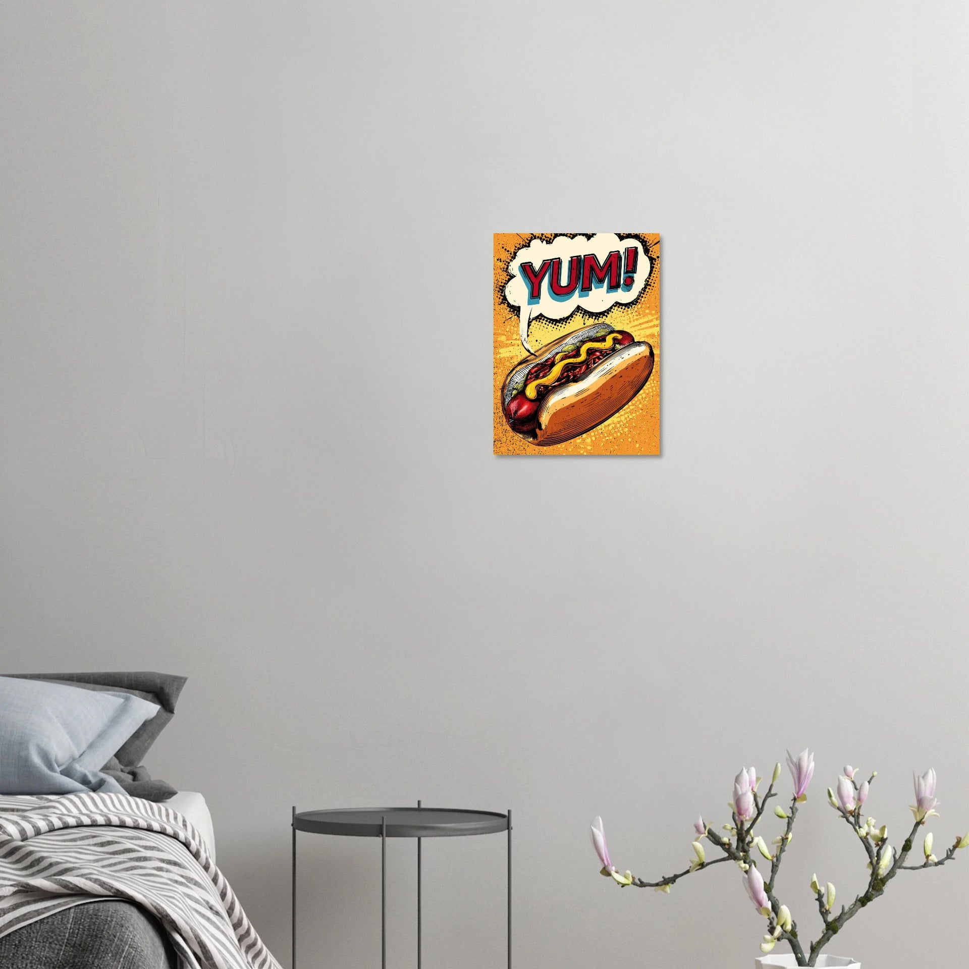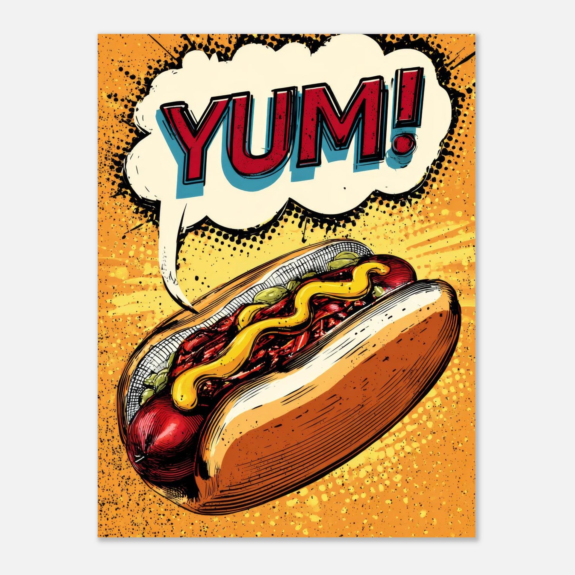 Bring a burst of playful energy and classic American diner charm to your space with our "Yum!" Hot Dog Pop Art poster. Inspired by retro comic book aesthetics and a love for iconic street food, this vibrant print captures the mouth-watering appeal of a perfectly dressed hot dog with bold colors and dynamic lines. It's the perfect statement piece for kitchens, dining areas, or any spot needing a dash of nostalgic fun.