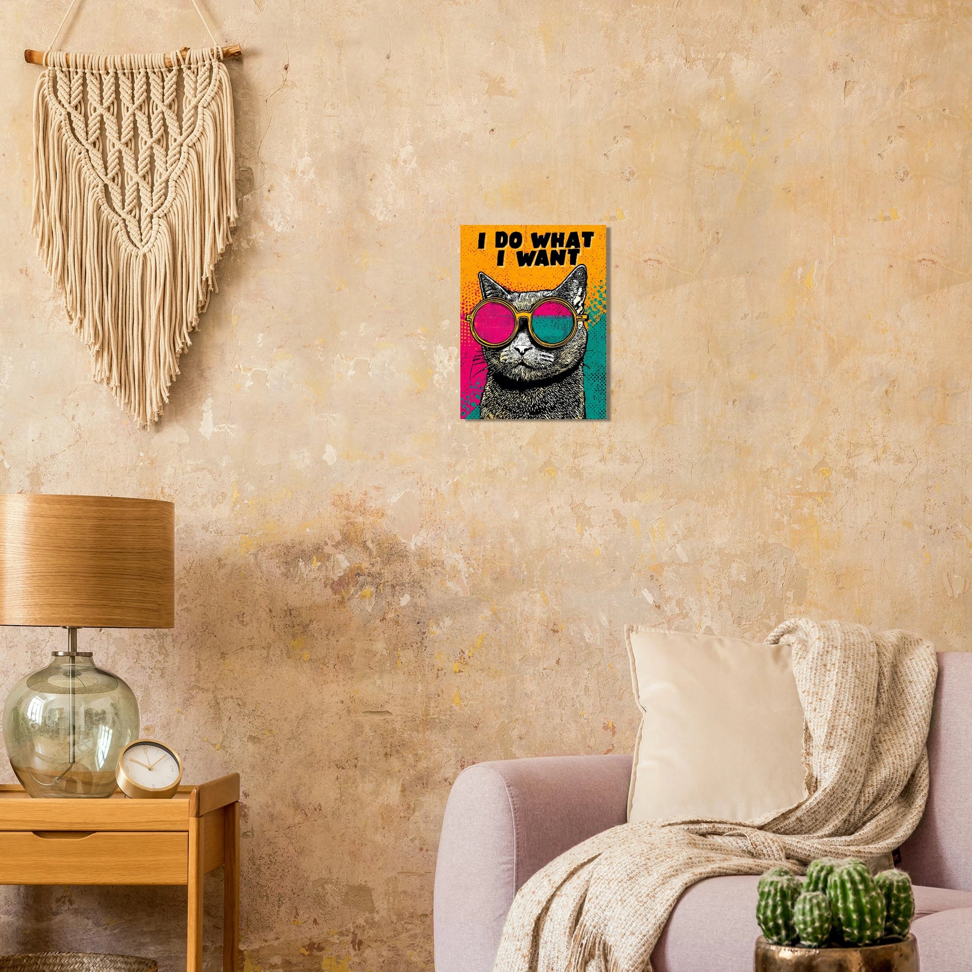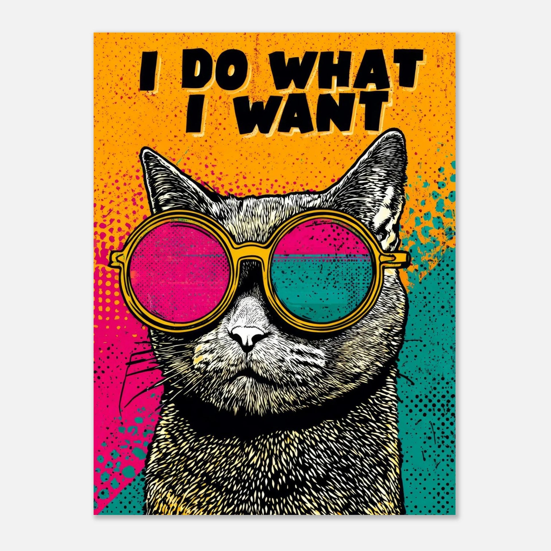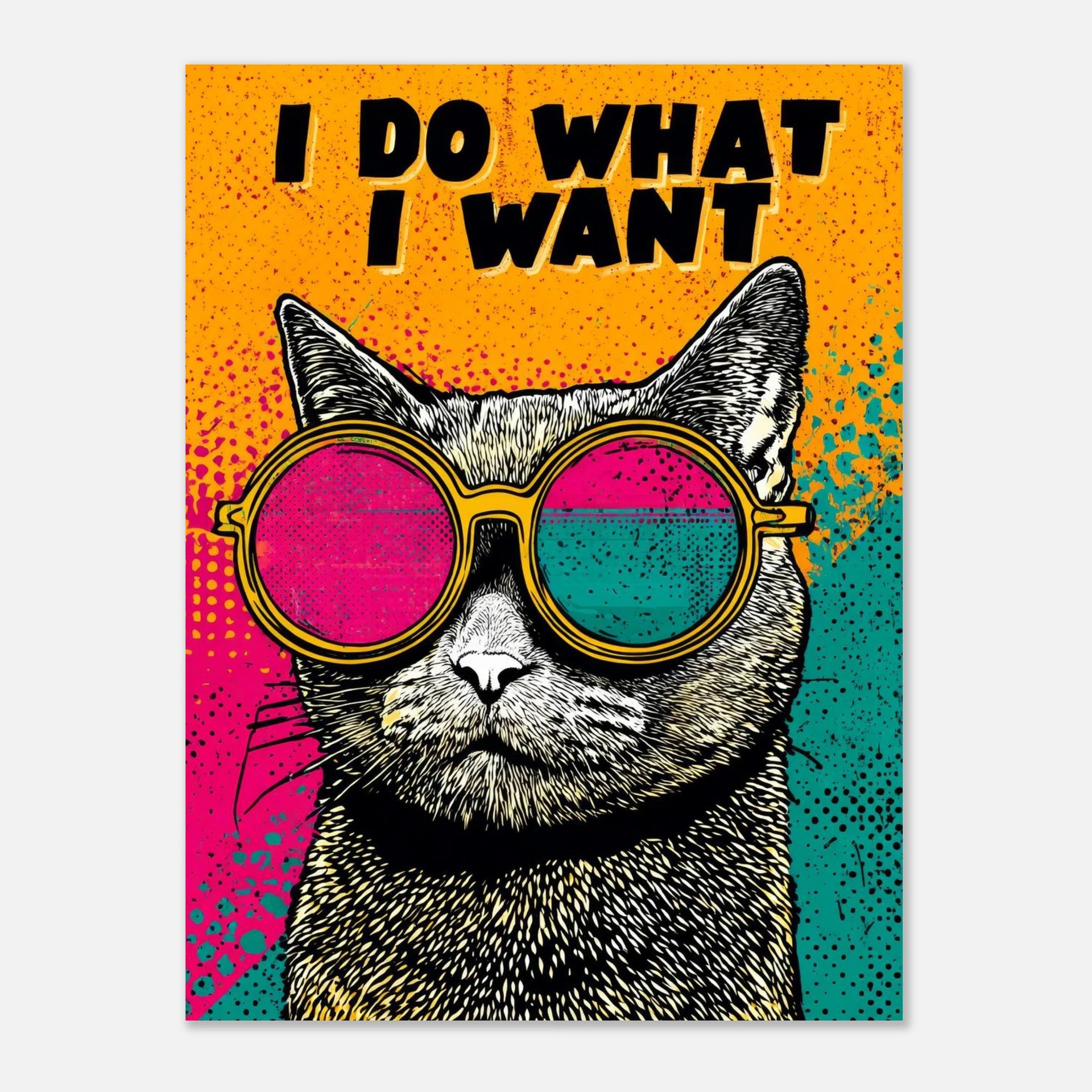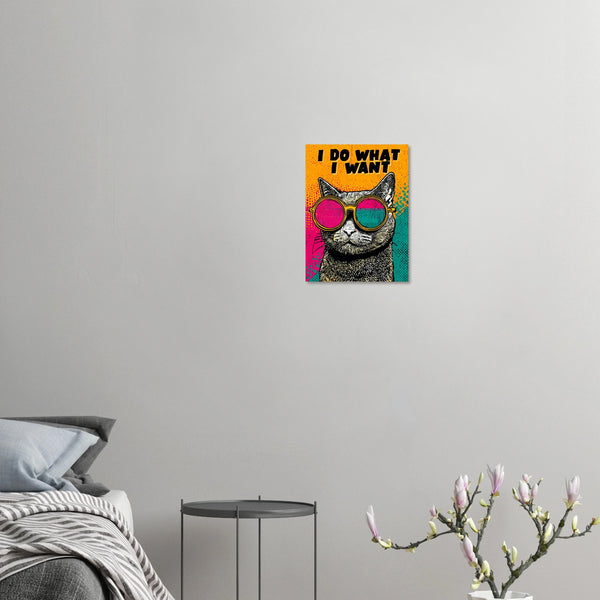 Unleash your inner rebel with this captivating "I Do What I Want" Pop Art Print, featuring a cool cat in vibrant, mismatched sunglasses. This striking piece captures the fearless spirit of independence with its electric...