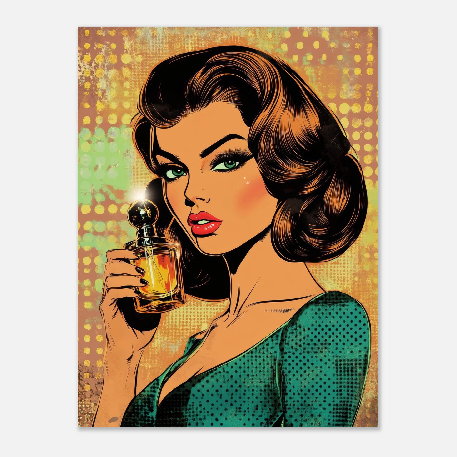 Unleash your inner siren with our "Retro Glamour" Pop Art print, a stunning homage to the golden age of Hollywood and the vibrant energy of classic pop art. This captivating piece brings a touch of audacious elegance and timeless allure to any room, featuring a striking portrait with rich emerald and fiery orange tones set against a playful, textured backdrop. It's more than just a print; it’s an invitation to infuse your space with bold personality and vintage charm.