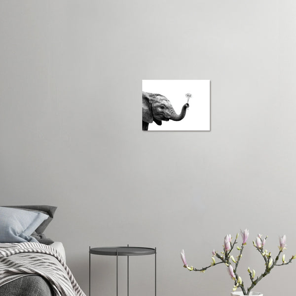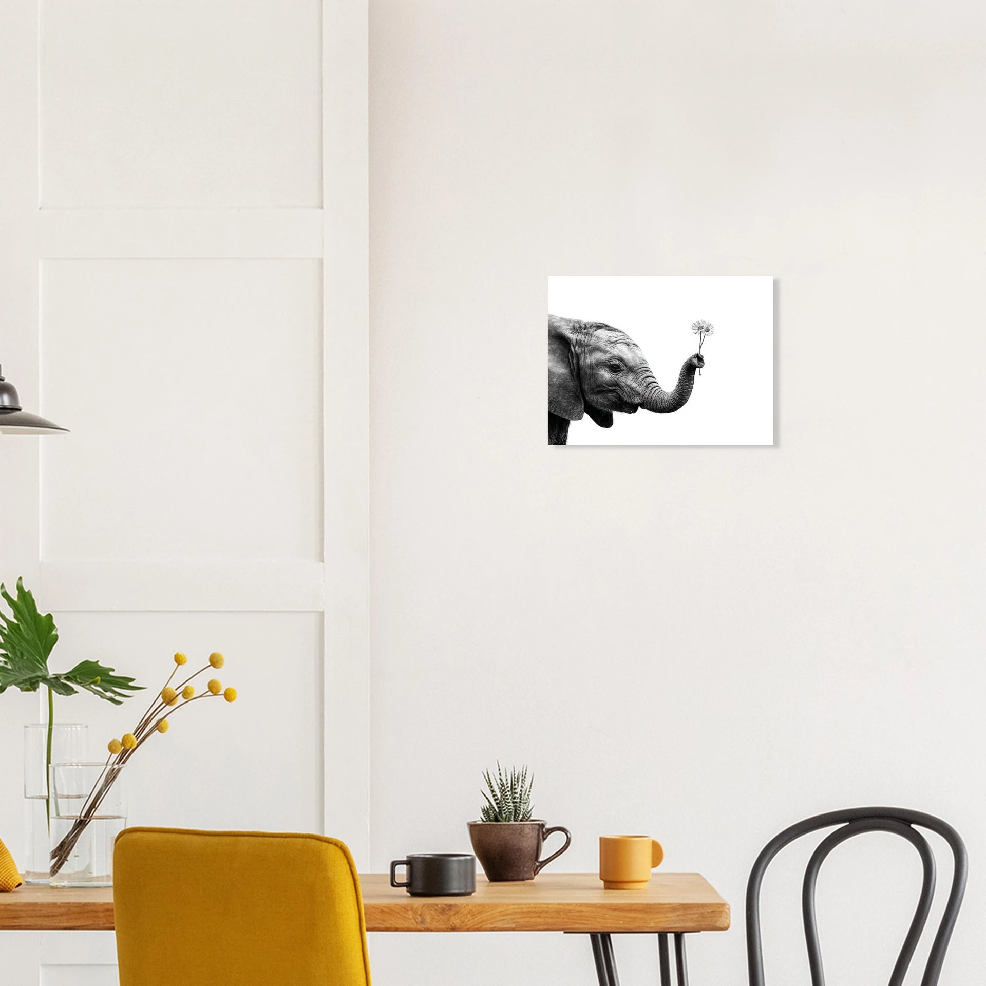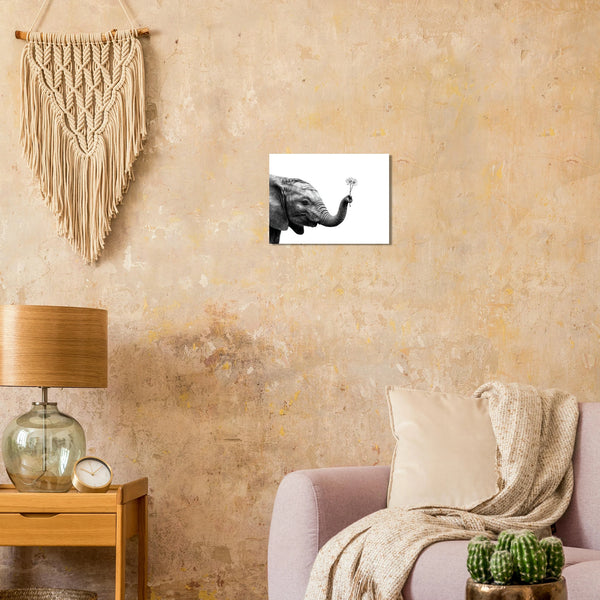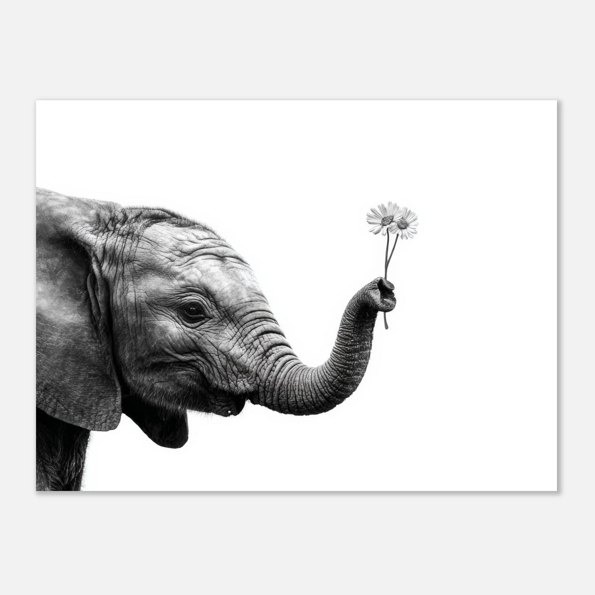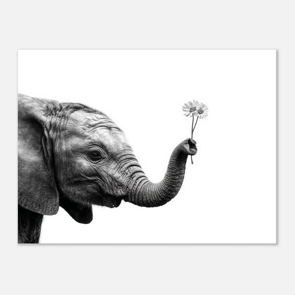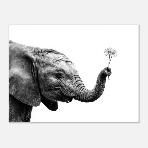 Bring a touch of serene majesty and delicate beauty into your space with this stunning art print. Our black and white portrayal of a gentle elephant, delicately holding a flower in its trunk, captures a...