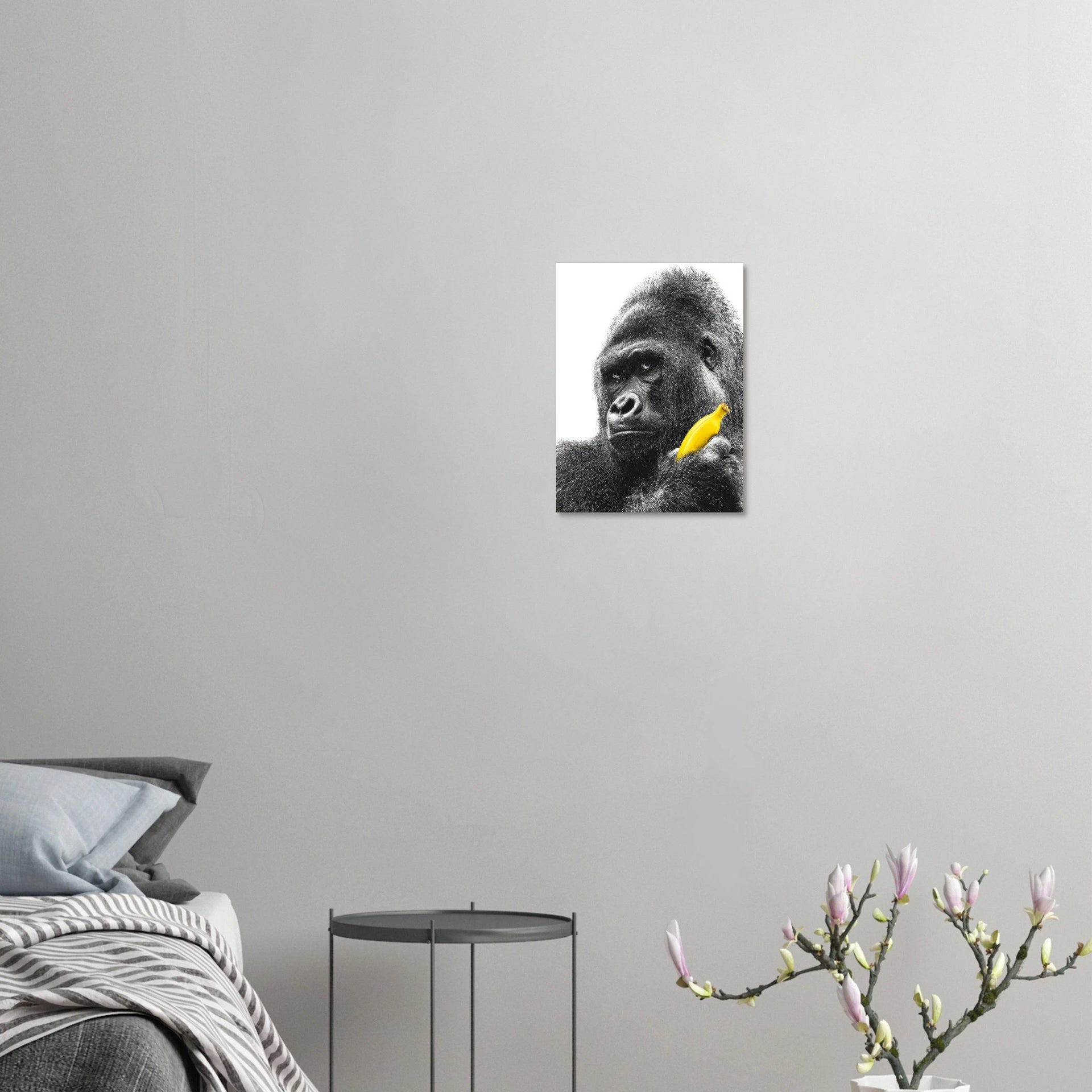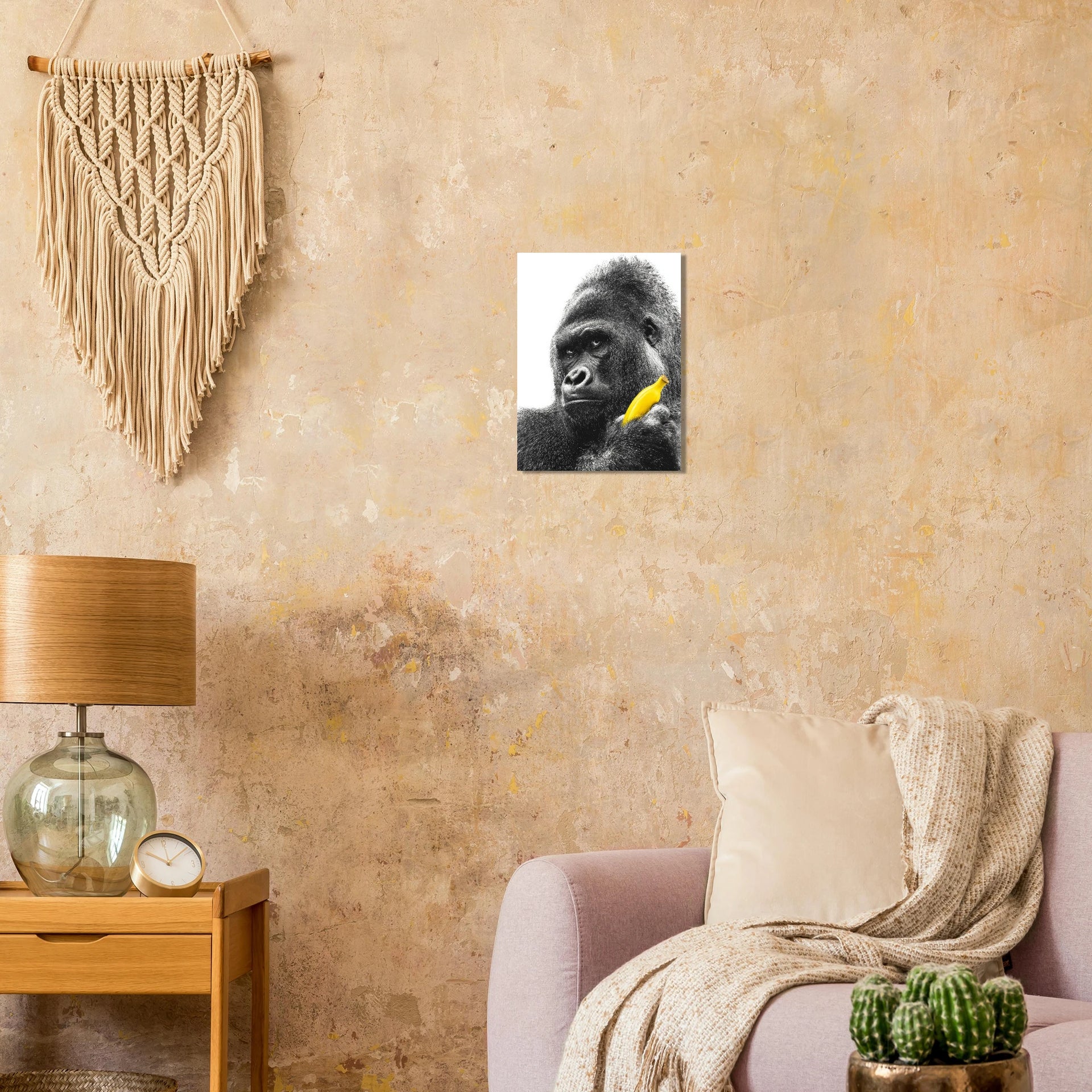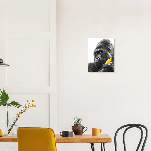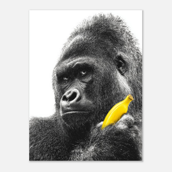 Bring a touch of thoughtful whimsy and powerful presence to your space with this captivating art print. Featuring a majestic ape in striking black and white, the vibrant pop of a yellow banana creates an unforgettable visual statement. This piece is perfect for adding character and a conversational focal point to any room, appealing to animal lovers and those who appreciate bold, graphic design.
