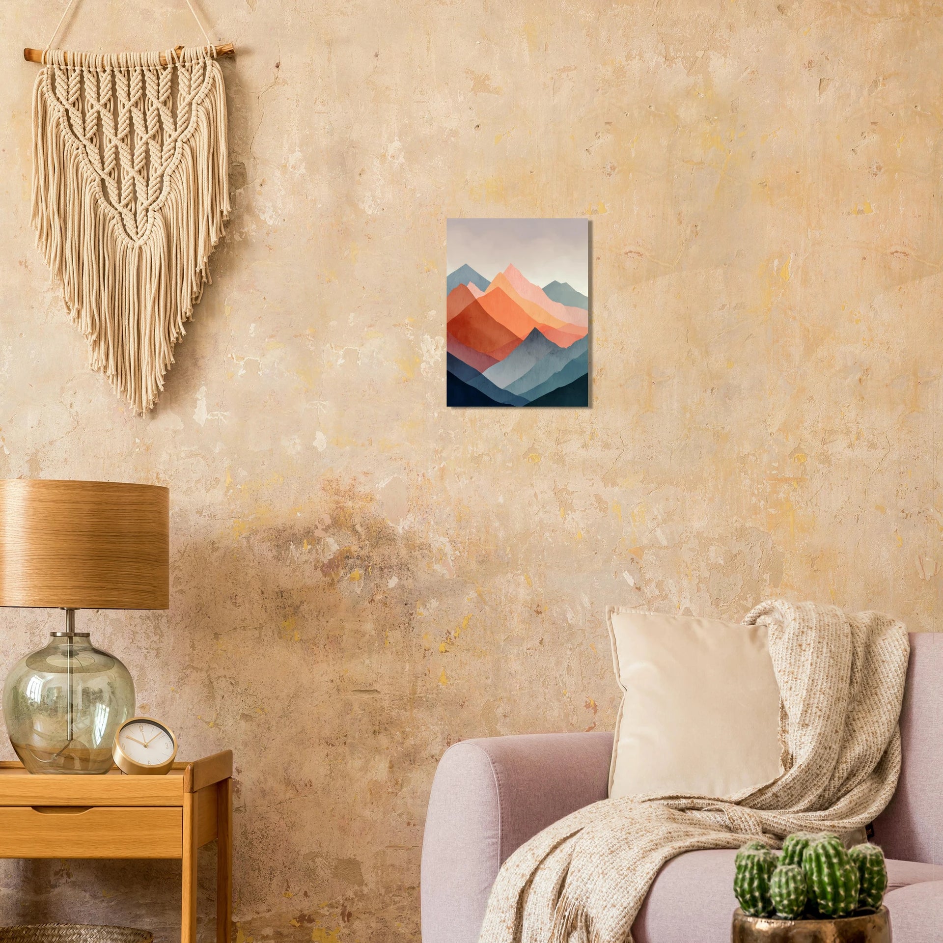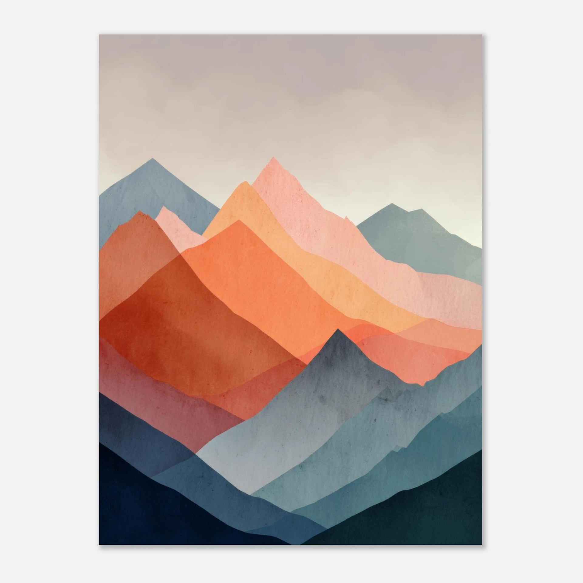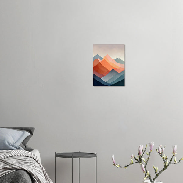 Bring the serene beauty of a layered landscape into your home with this captivating abstract mountain art print. Featuring a striking interplay of warm sunset oranges and cool indigo blues, this piece evokes the tranquility of dusk and dawn. Its contemporary style, with clean lines and a rich, textured appearance, offers a sophisticated touch to any modern living space or office.