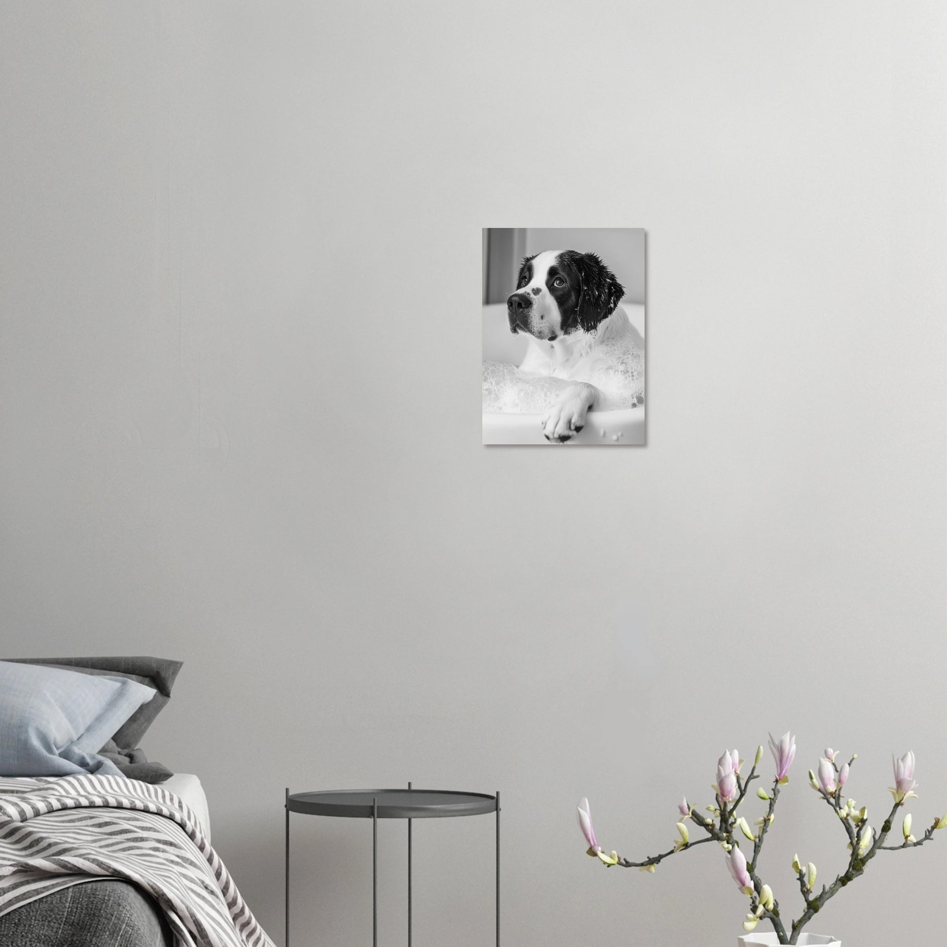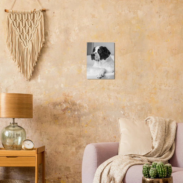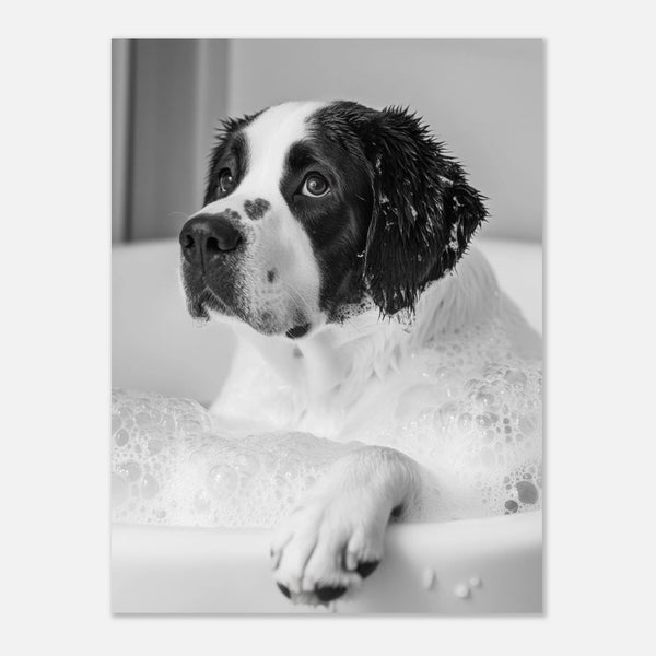 Bring a touch of heartwarming innocence into your home with this captivating art print, featuring an adorable puppy enjoying a bubbly bath. The monochromatic palette highlights the puppy's sweet expression and the playful texture of the suds, creating a timeless and endearing piece perfect for any animal lover's space.
