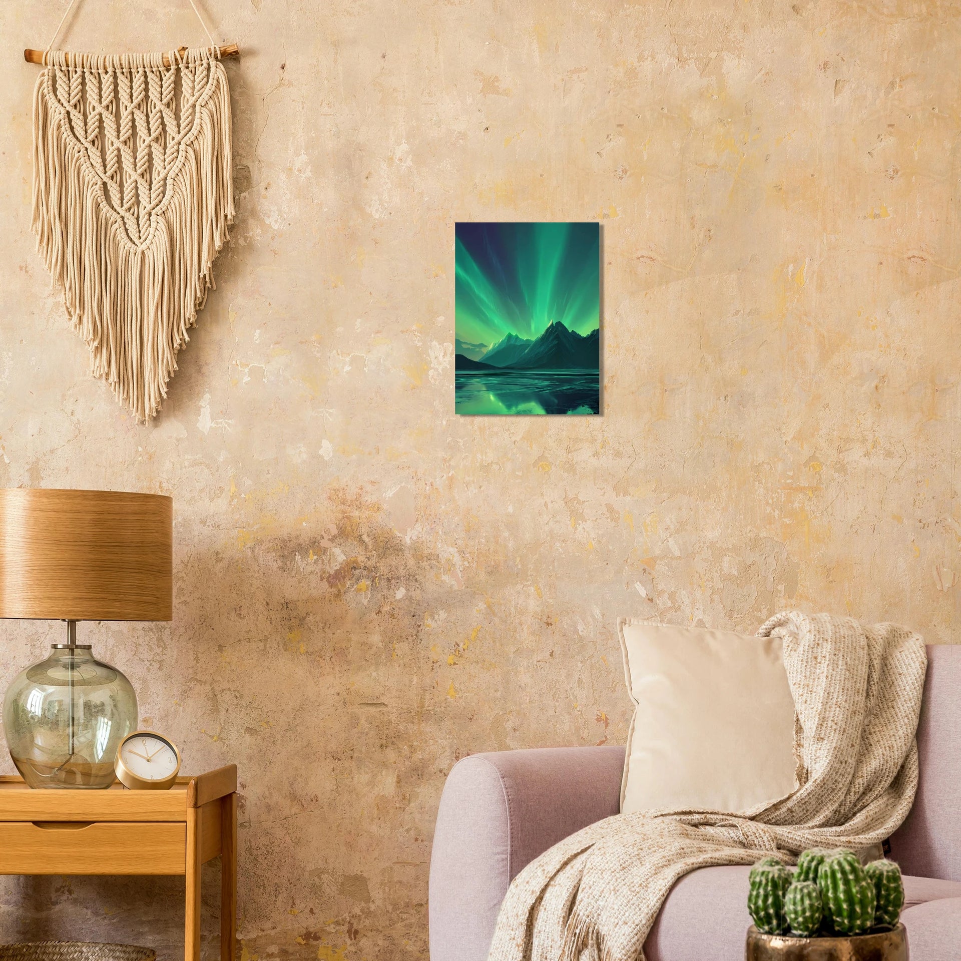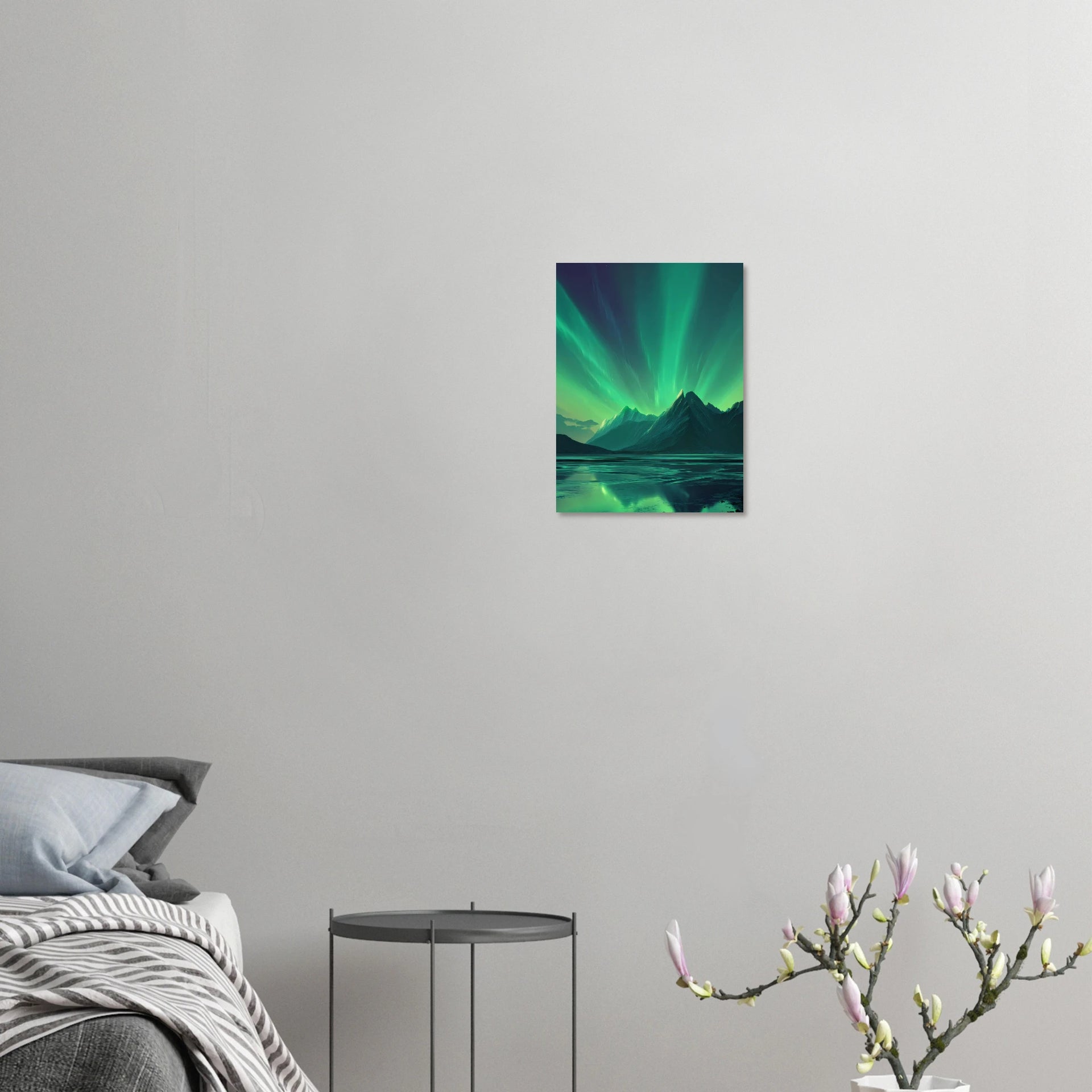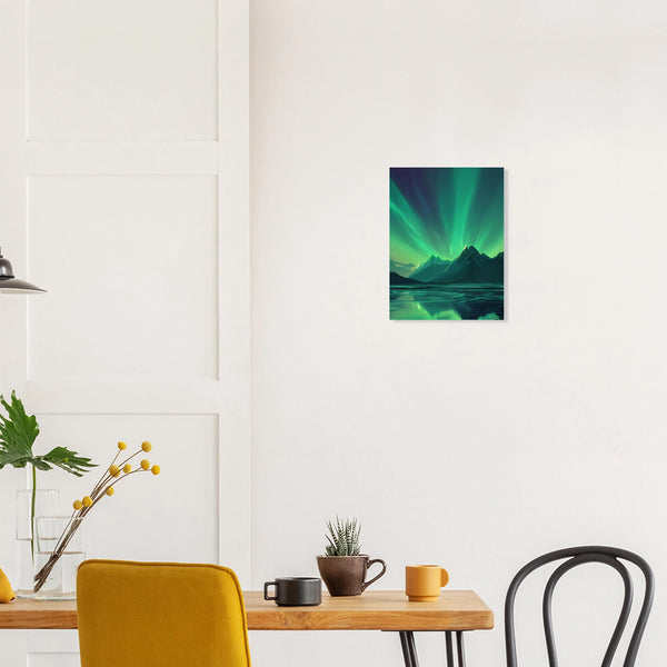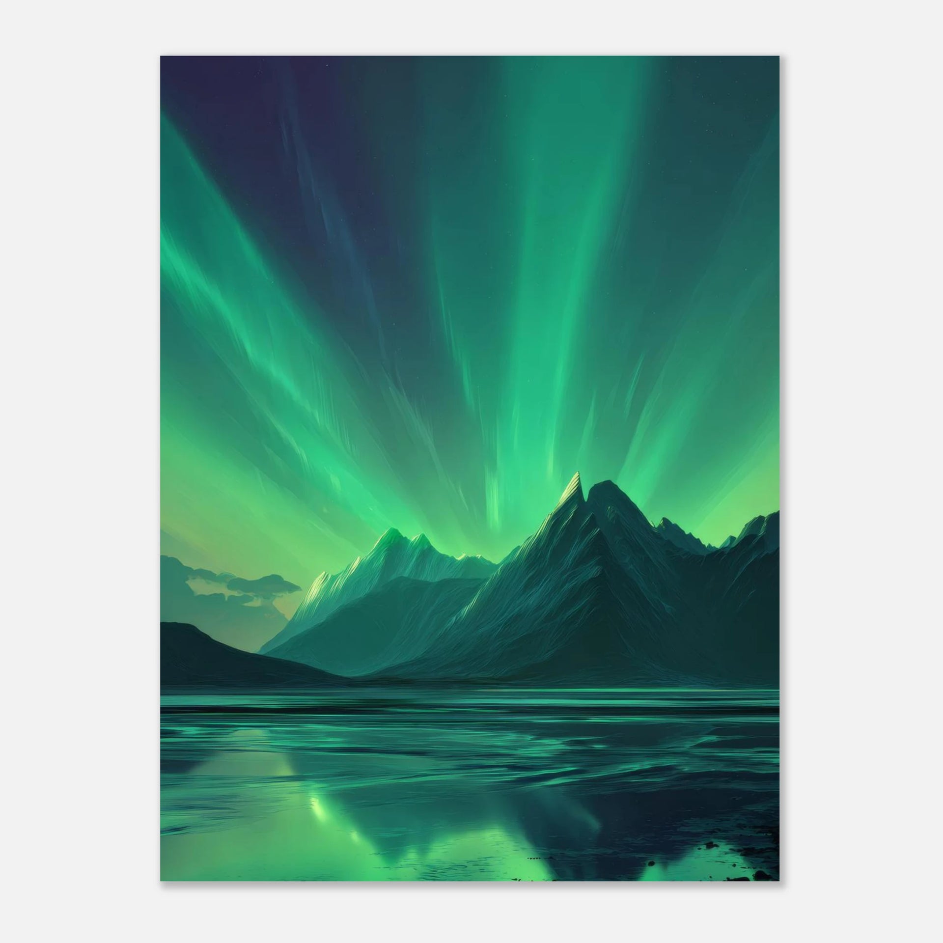 Immerse yourself in the ethereal glow of the Northern Lights with this captivating pop art print. Inspired by the breathtaking beauty of the aurora borealis dancing over serene mountains and reflective waters, this piece transforms any space into a vibrant spectacle. The bold, stylized lines and vivid green hues capture the dynamic energy of nature's most stunning light show, making it a perfect statement piece for art lovers and nature enthusiasts alike.
